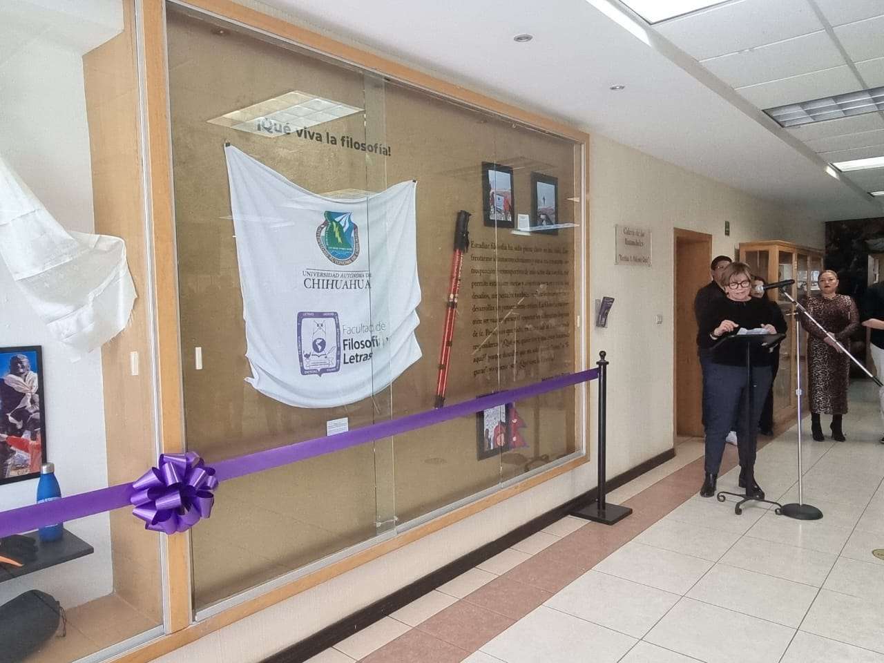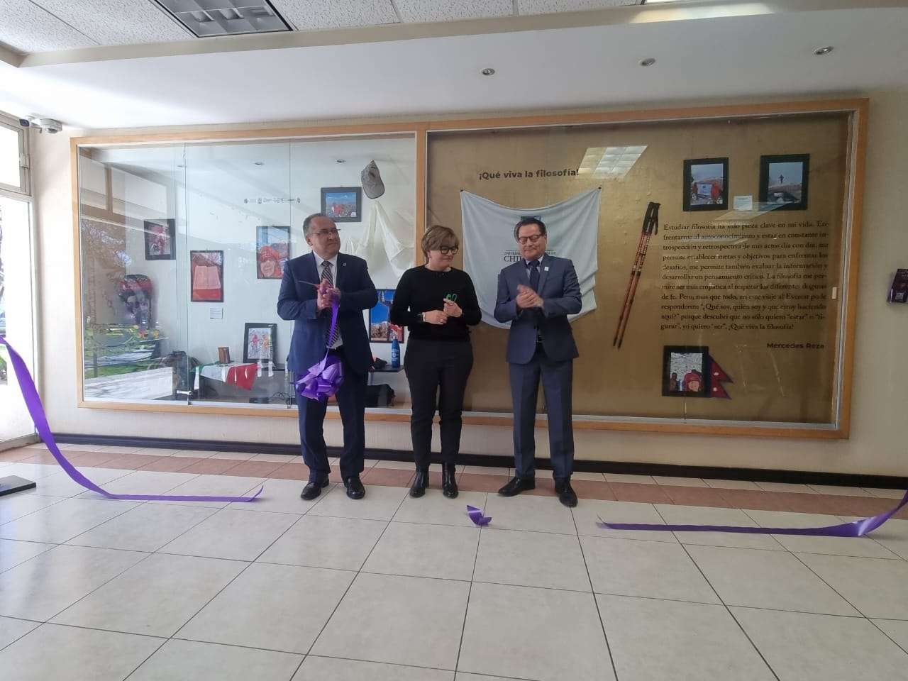 Chihuahua.- Esta mañana, la estudiante Mercedes Reza, en compañía del rector de la Universidad Autónoma de Chihuahua (UACH), Luis Alfonso Rivera Campos, y del director de la Facultad de Filosofía y Letras, Javier Contreras Orozco, inauguraron la exposición titulada "¡Viva la Filosofía!".