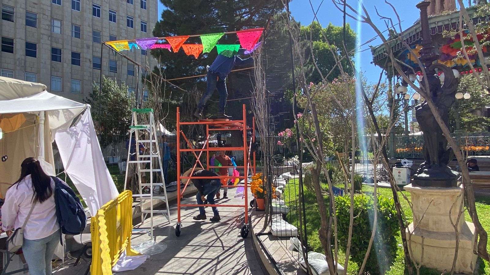 Chihuahua.– Con motivo del tradicional festival El Regreso de las Ánimas, una cuadrilla de trabajadores inició la decoración del emblemático Kiosco de la Plaza de Armas, que será el corazón de los festejos del Día de Muertos.