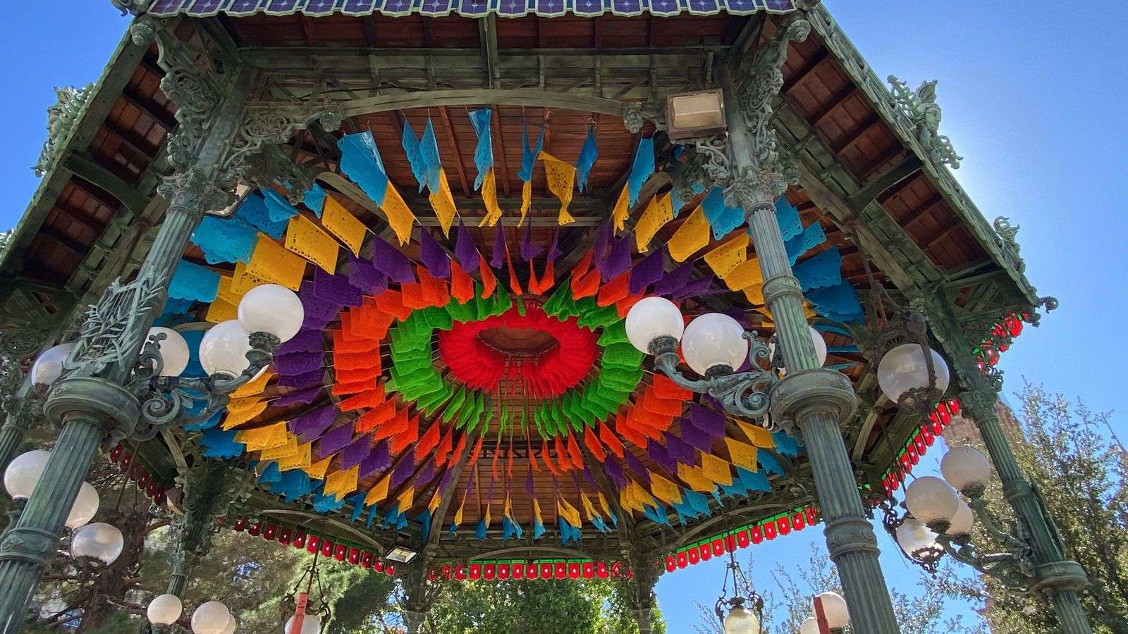 El espacio comienza a llenarse de color con papel picado en tonos vibrantes, creando un ambiente festivo que honra la memoria de quienes han partido.