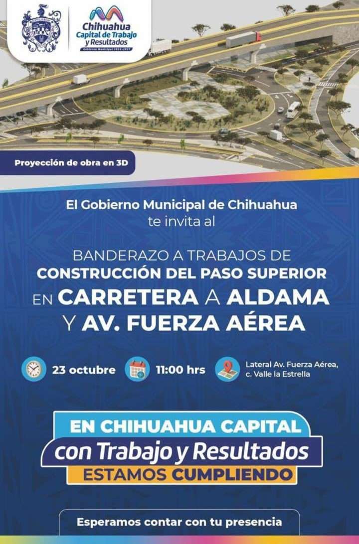 Chihuahua.- El Gobierno Municipal de Chihuahua, a través de la Dirección de Obras Públicas, dio a conocer que el próximo 23 de octubre se llevará a cabo el banderazo de arranque para la construcción del paso superior en la carretera a Aldama y avenida Fuerza Aérea.