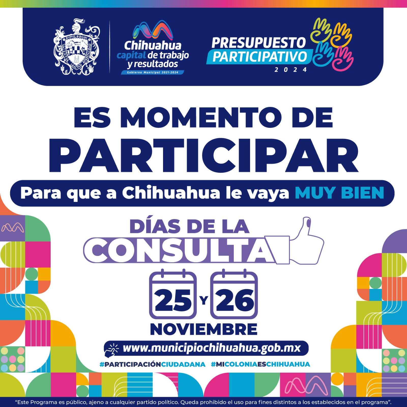 Chihuahua, Chih.- El próximo 25 y 26 de noviembre, el Gobierno Municipal que preside el alcalde Marco Bonilla, a través de la Dirección de Desarrollo Humano y Educación, realizará la consulta del Presupuesto Participativo 2024, para elegir los proyectos propuestos por la ciudadanía para desarrollar el próximo año en beneficio de las familias chihuahuenses.