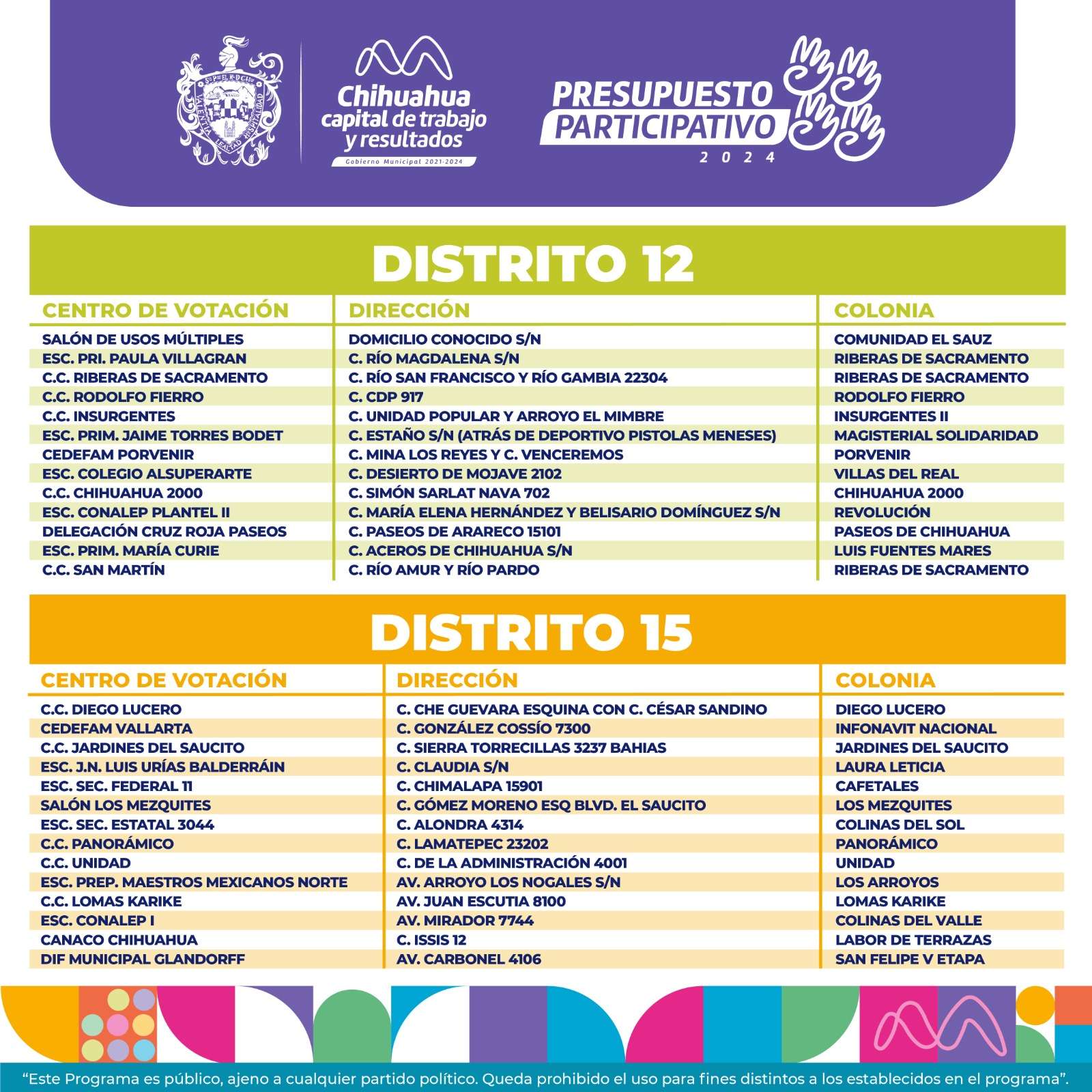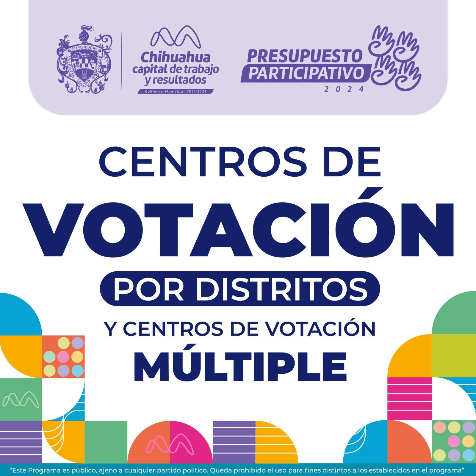 Además, serán instaladas 73 sedes de votación en distintos puntos de la ciudad de Chihuahua, de los cuales cinco serán centros de votación múltiple (Presidencia, Deportivo Tricentario, Casa de la Juventud, la Dirección de Desarrollo Urbano y Ecología y el CRIT), la ubicación de cada entro la puedes conocer en la página: https://www.municipiochihuahua.gob.mx/CCS/Convocatorias/CONSULTA_AQUÍ_CENTROS_DE_VOTACIÓN_DEL_PRESUPUESTO_PARTICIPATIVO_2024, los cuales abrirán sus puertas a partir de las 9:00 de la mañana, hasta las 7:00 de la tarde, en ambos días de la consulta .