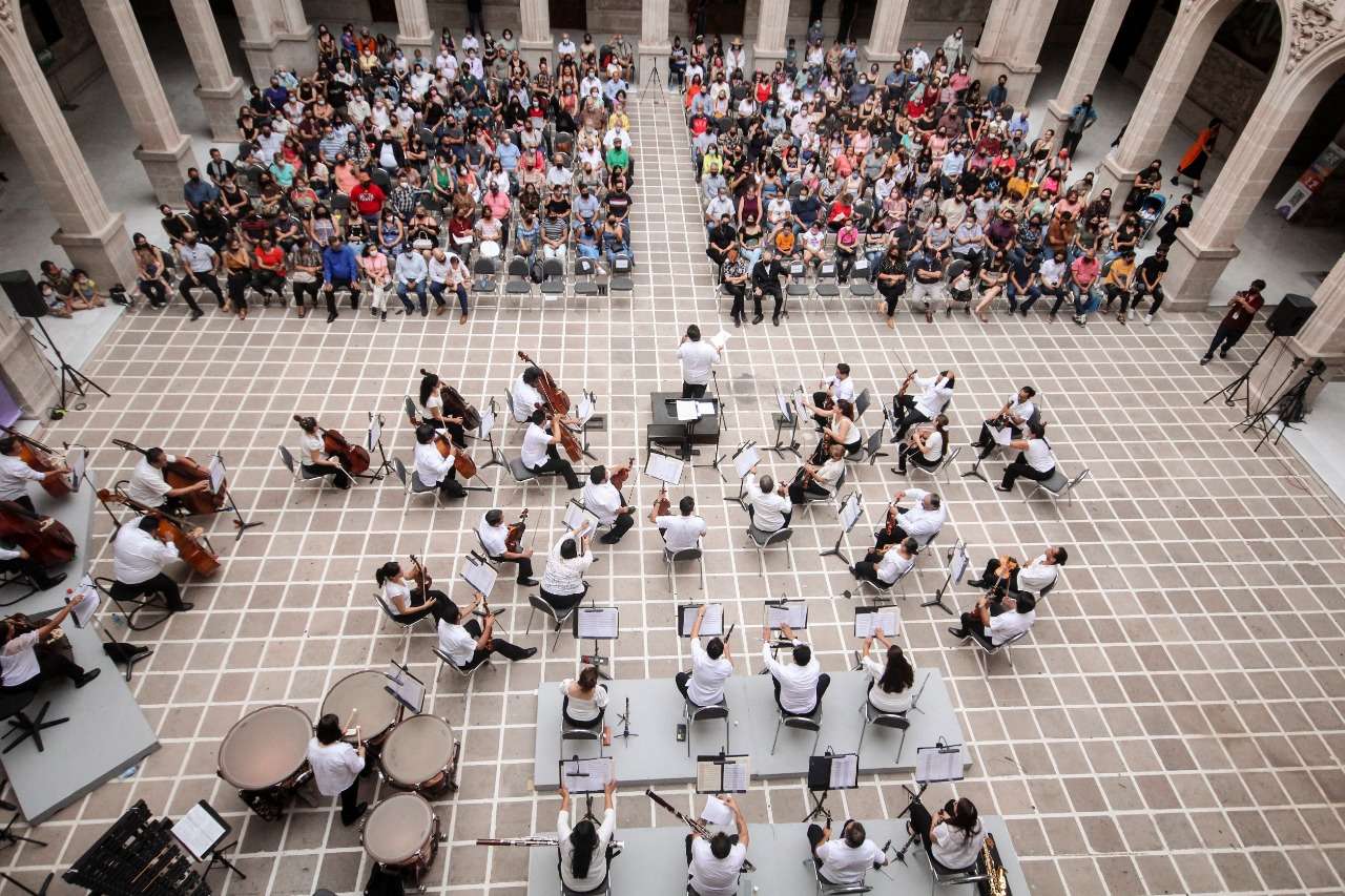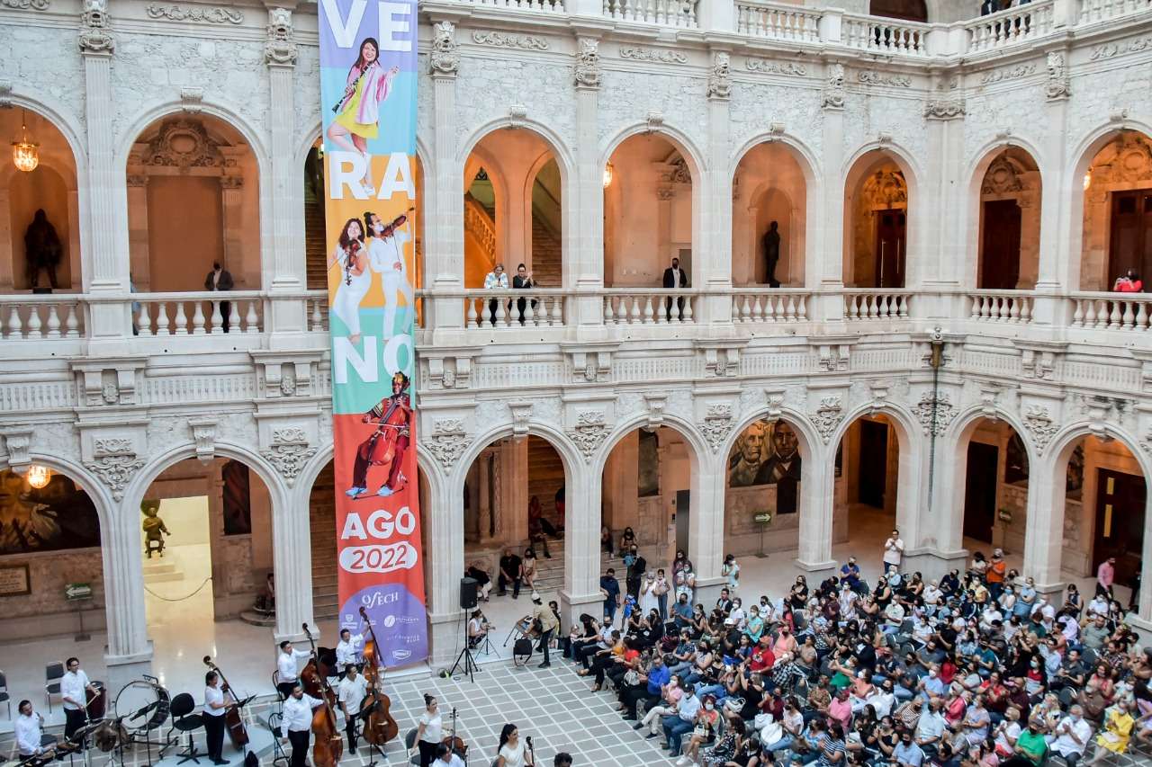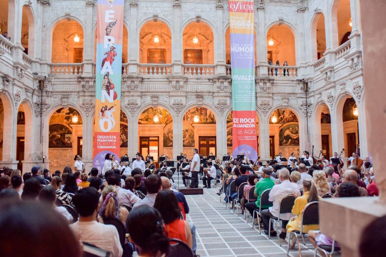 Chihuahua, Chih. - Con música de compositores clásicos como Rossini, Beethoven, Julius Fucik y Félix Mendelssohn, el Gobierno del Estado, a través de la Secretaría de Cultura, y en compañía de la gobernadora Maru Campos, dio comienzo a la Temporada de Verano de conciertos de la Orquesta Filarmónica del Estado de Chihuahua con el espectáculo “Con-Cierto Humor” en el patio central de Palacio de Gobierno.