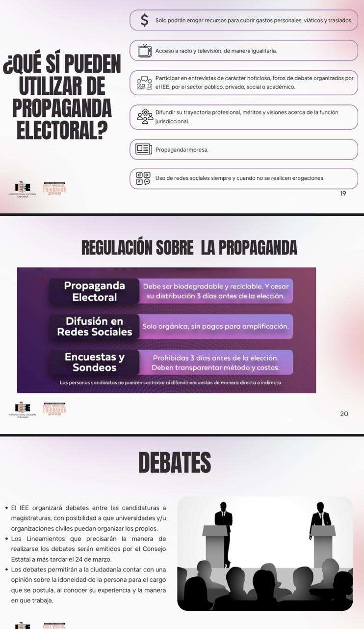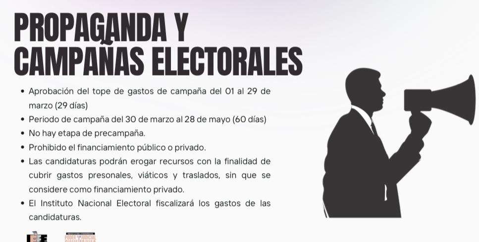 La consejera presidenta del IEE, Yanko Durán Prieto, destacó que la aprobación del tope de gastos de campaña será entre el 1 y el 29 de marzo, y el periodo de campaña será del 30 de marzo al 28 de mayo (60 días). No habrá etapa de precampaña, y está prohibido el financiamiento público o privado. Las candidaturas podrán erogar recursos exclusivamente para cubrir gastos personales, viáticos y traslados, sin que se considere financiamiento privado. Además, el Instituto Nacional Electoral fiscalizará los gastos de las candidaturas.