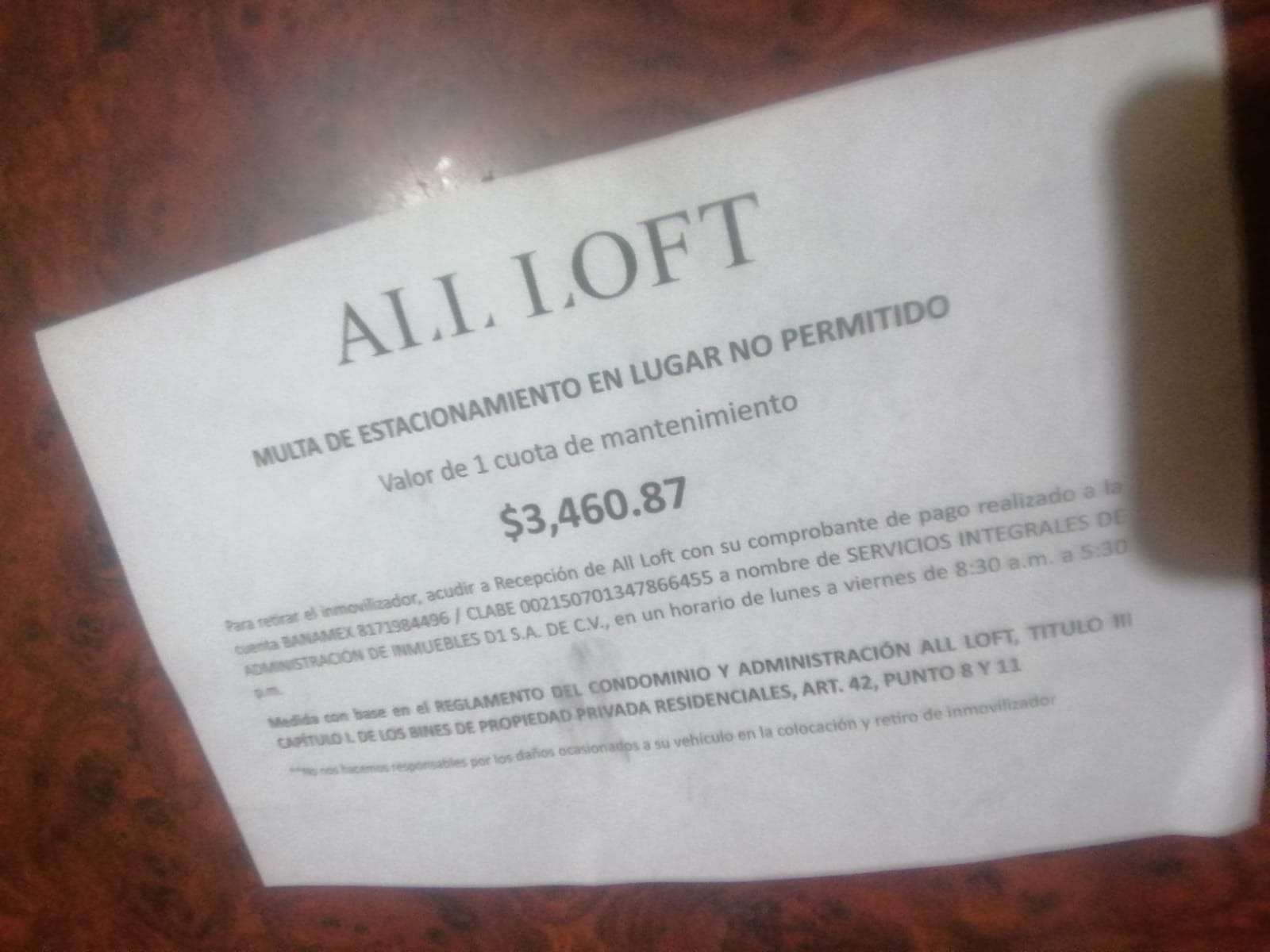 Se trata de un cobro por 3 mil 460.87 pesos, en la “papeleta” dice lo siguiente: All Loft, multa de estacionamiento en lugar no permitido, valor de una cuota de estacionamiento, Para retirar el inmovilizador, acudir a recepción de All Loft con su comprobante de pago realizado en la cuenta Banamex 8171984496/ a nombre de servicios integrales de administración de inmuebles D1 S.A. de C.V., en un horario de lunes a viernes de 08:30 a 5:30 pm.