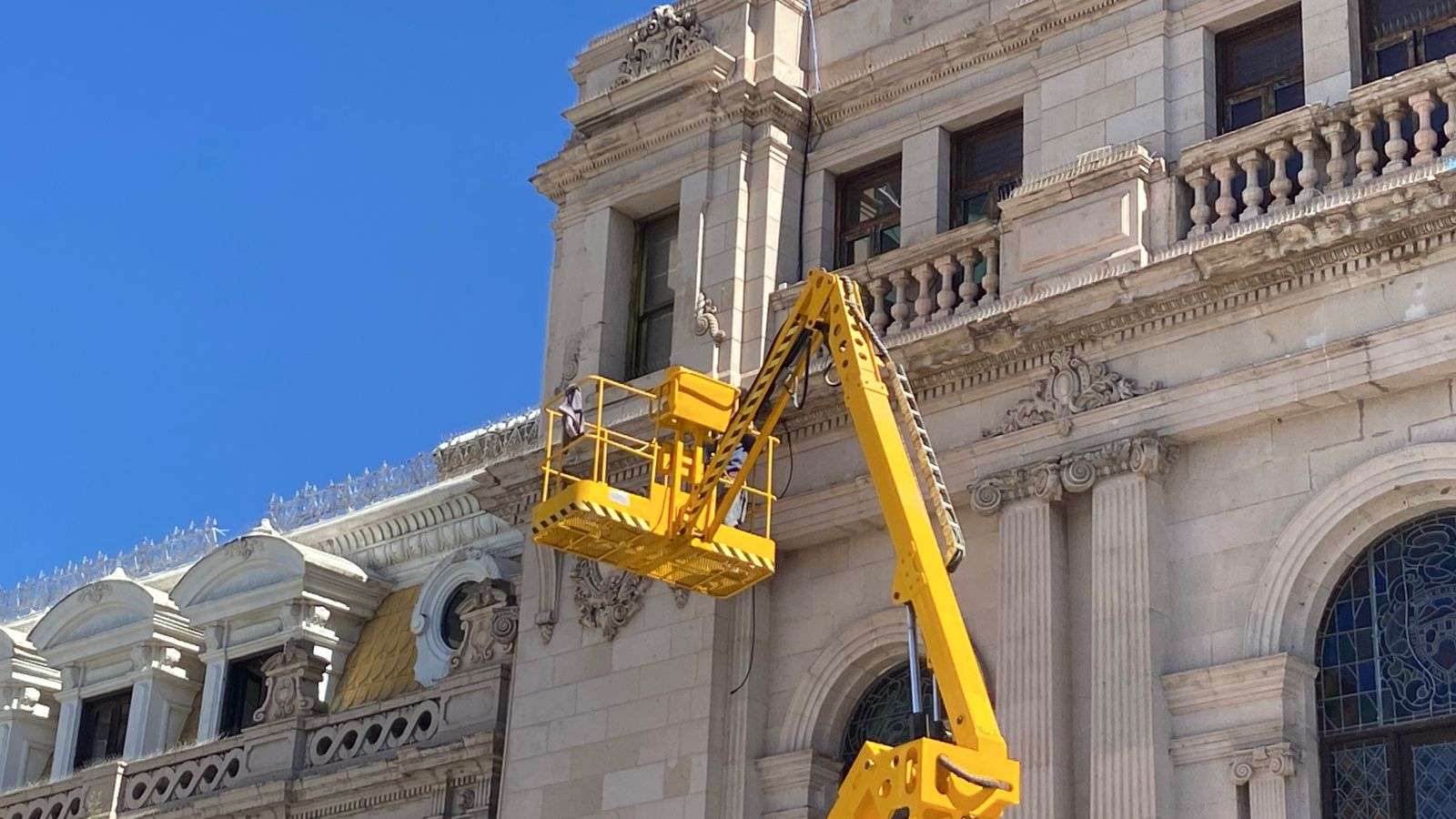 Chihuahua.- Una cuadrilla de trabajadores inició la instalación de cableado en el edificio de la Presidencia Municipal, con el objetivo de colocar lámparas LED que iluminarán la fachada de cantera.