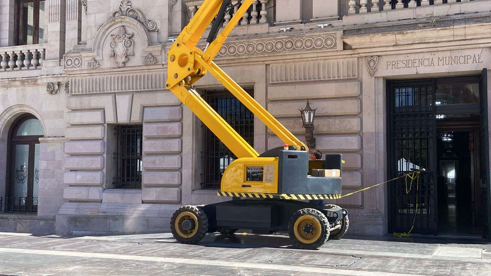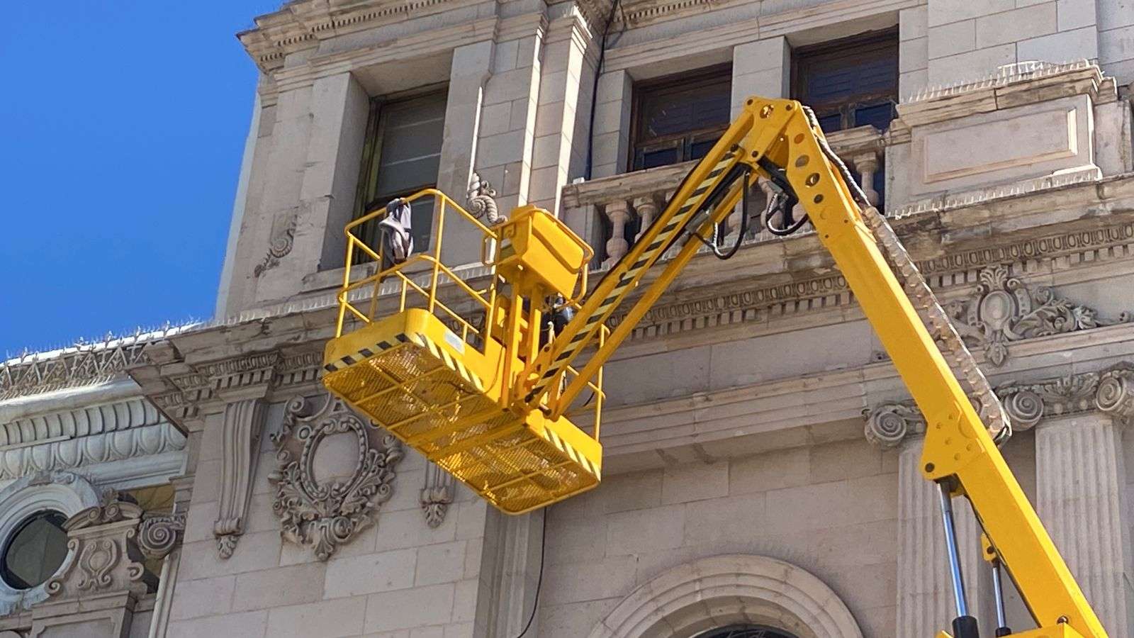 Con el apoyo de una grúa, los empleados colocaron varios metros de cable de uso rudo en la parte frontal del edificio, lo que permitirá conectar las nuevas luminarias.