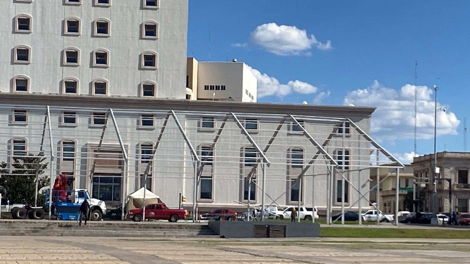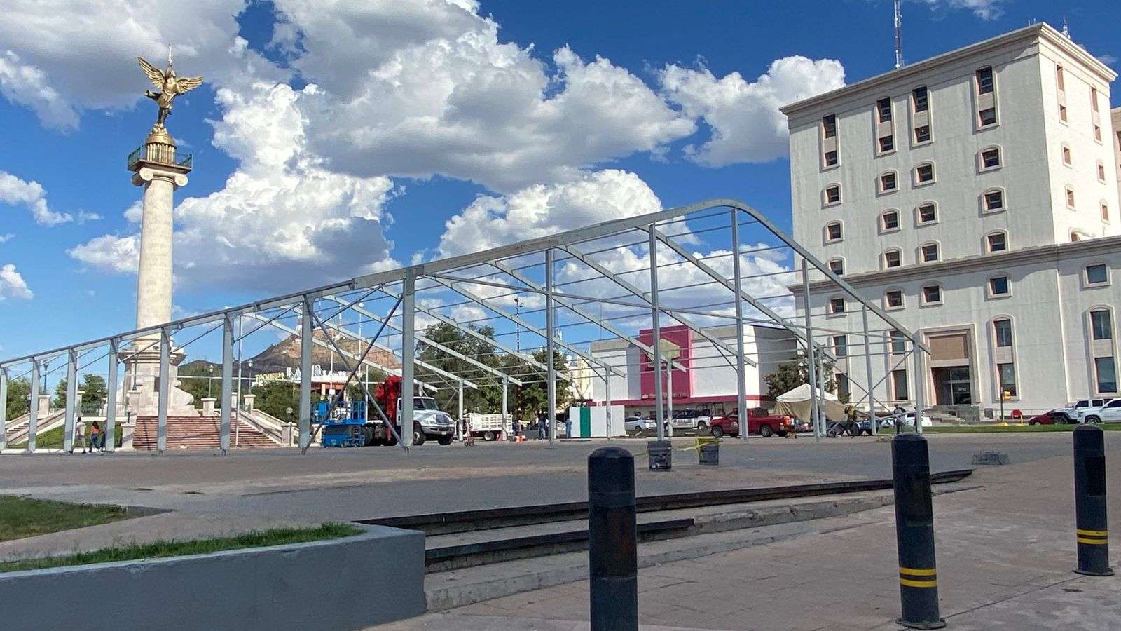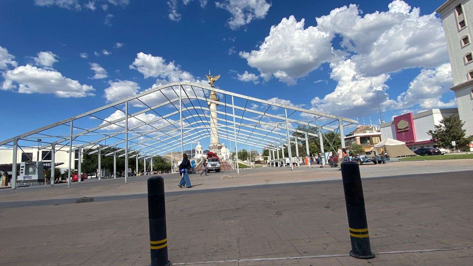 Chihuahua.- Una cuadrilla de trabajadores inició la instalación de una estructura en la Plaza del Ángel, con dimensiones de 30 metros de frente, 45 de fondo y 10 de altura, como parte de los preparativos para la tradicional celebración del Día de Muertos.