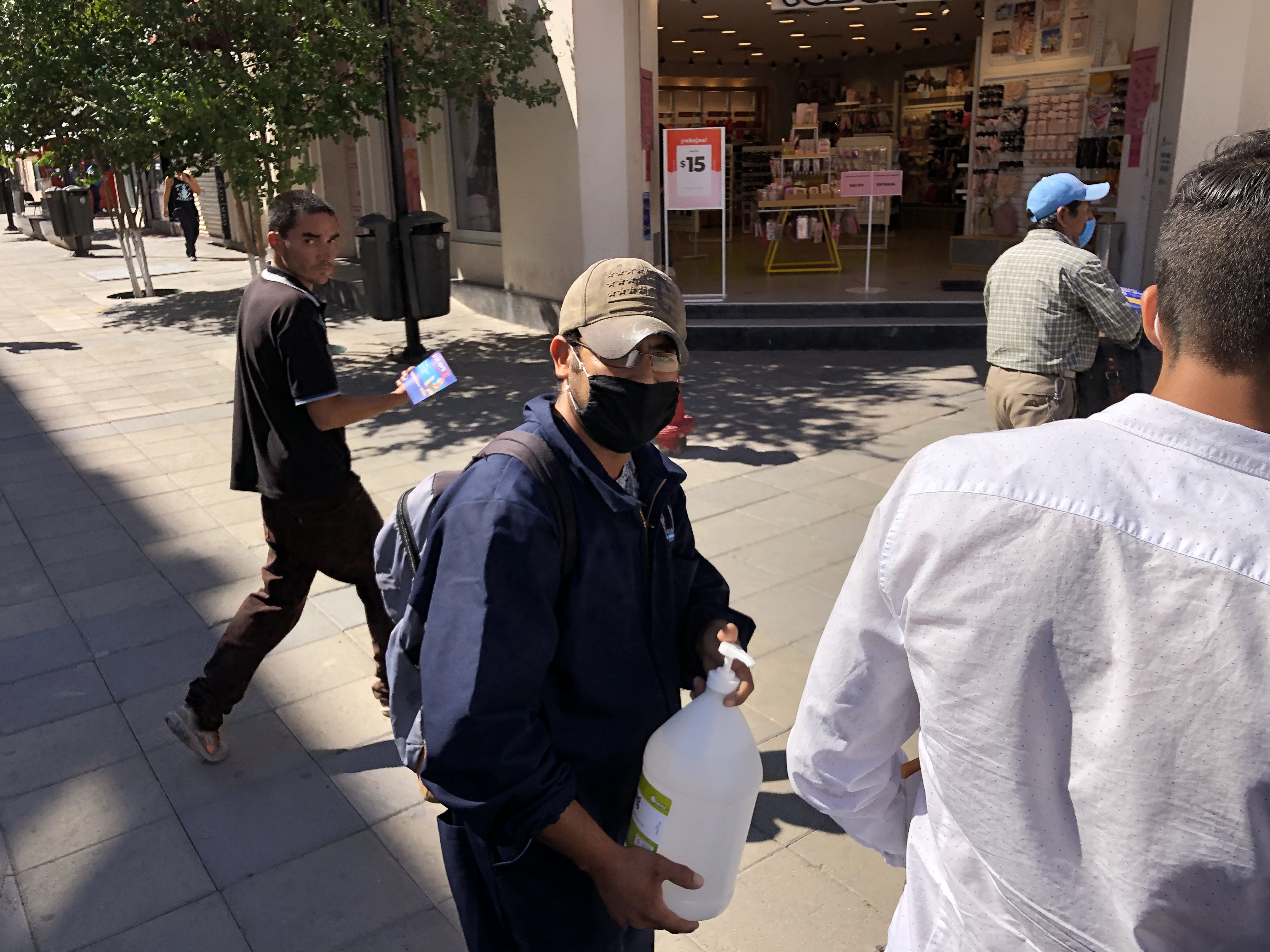 Cada persona que circula por estos espacios debe someterse a que le tomen la temperatura, y aceptar gel antibacterial.