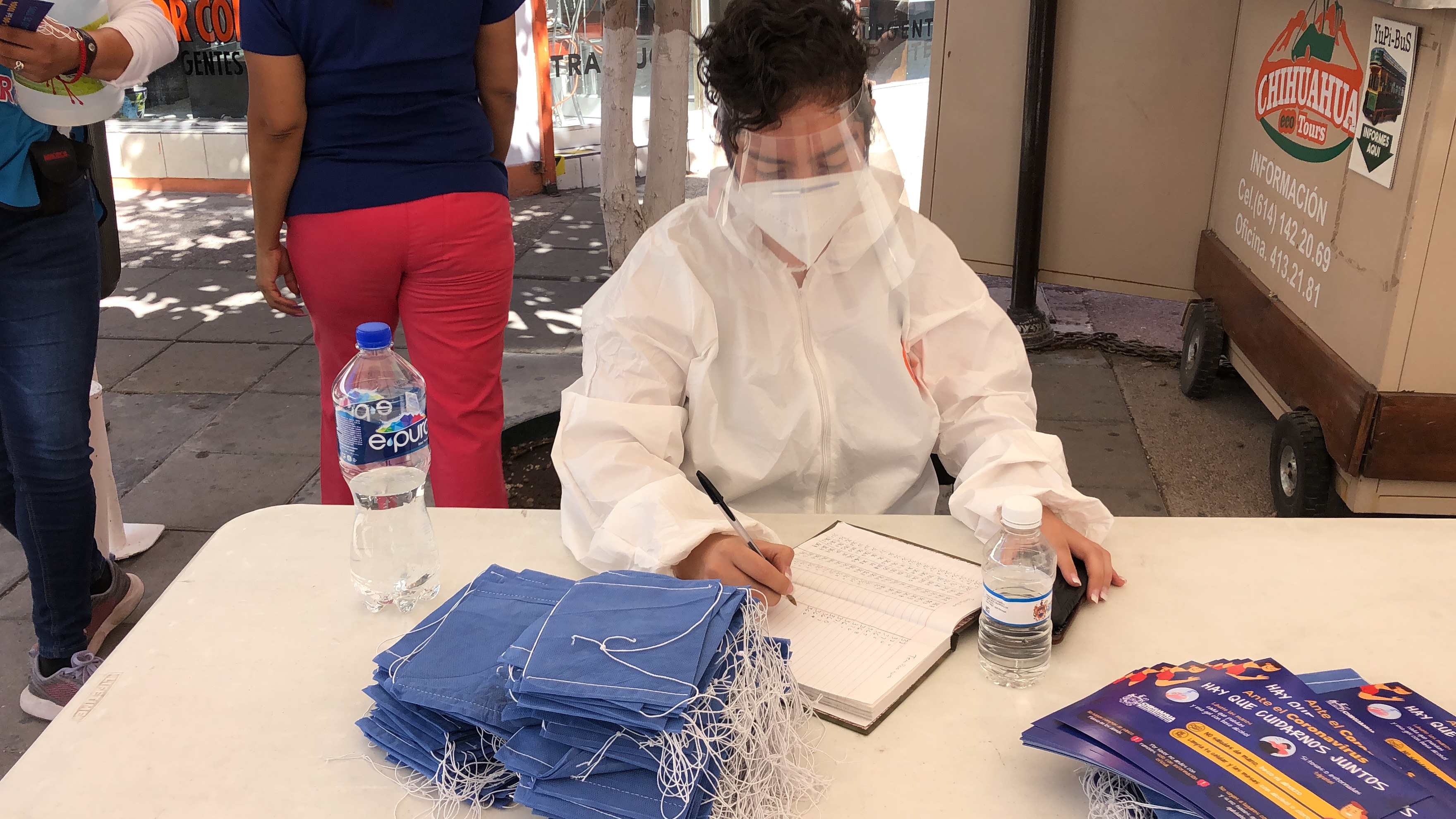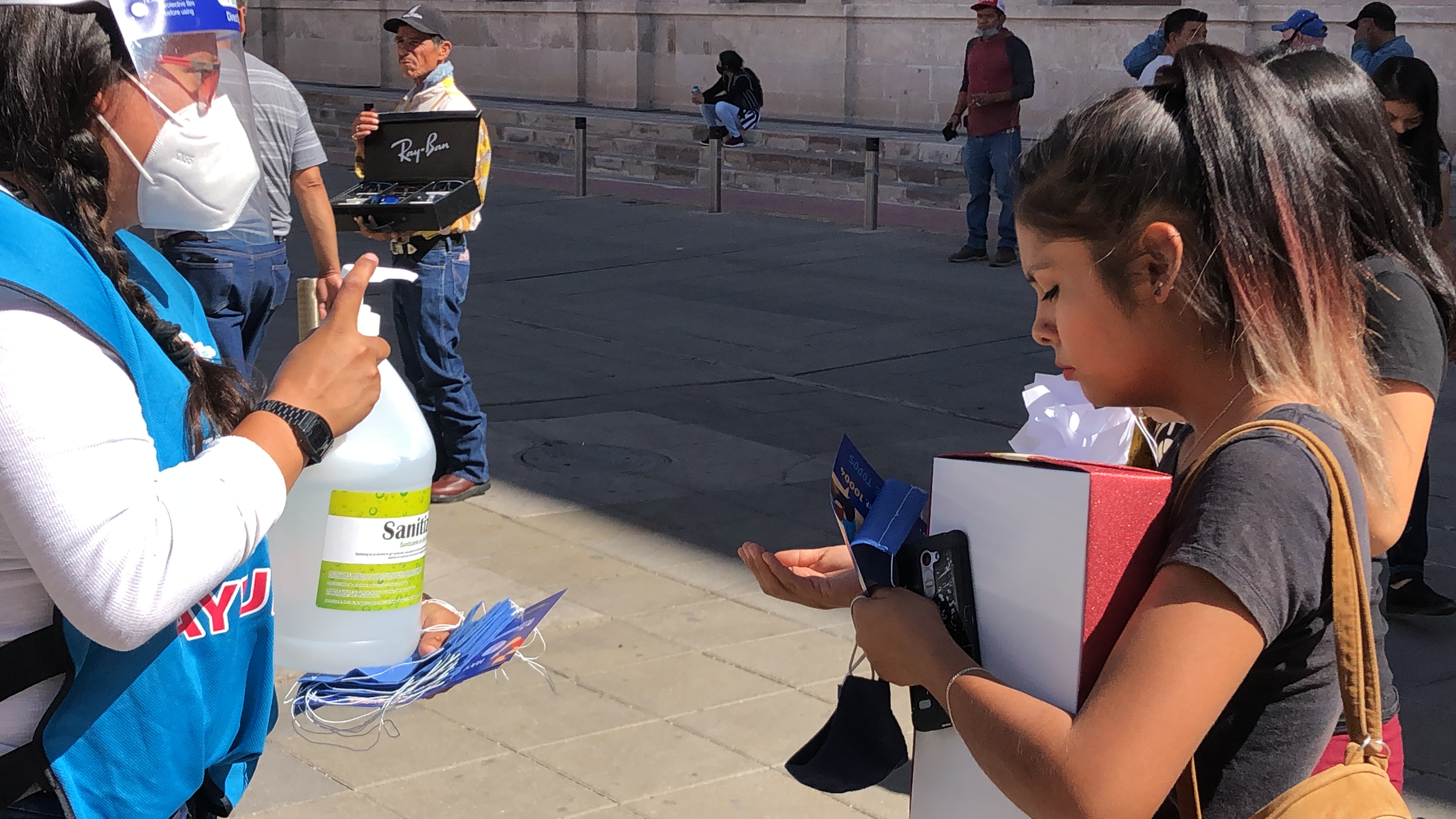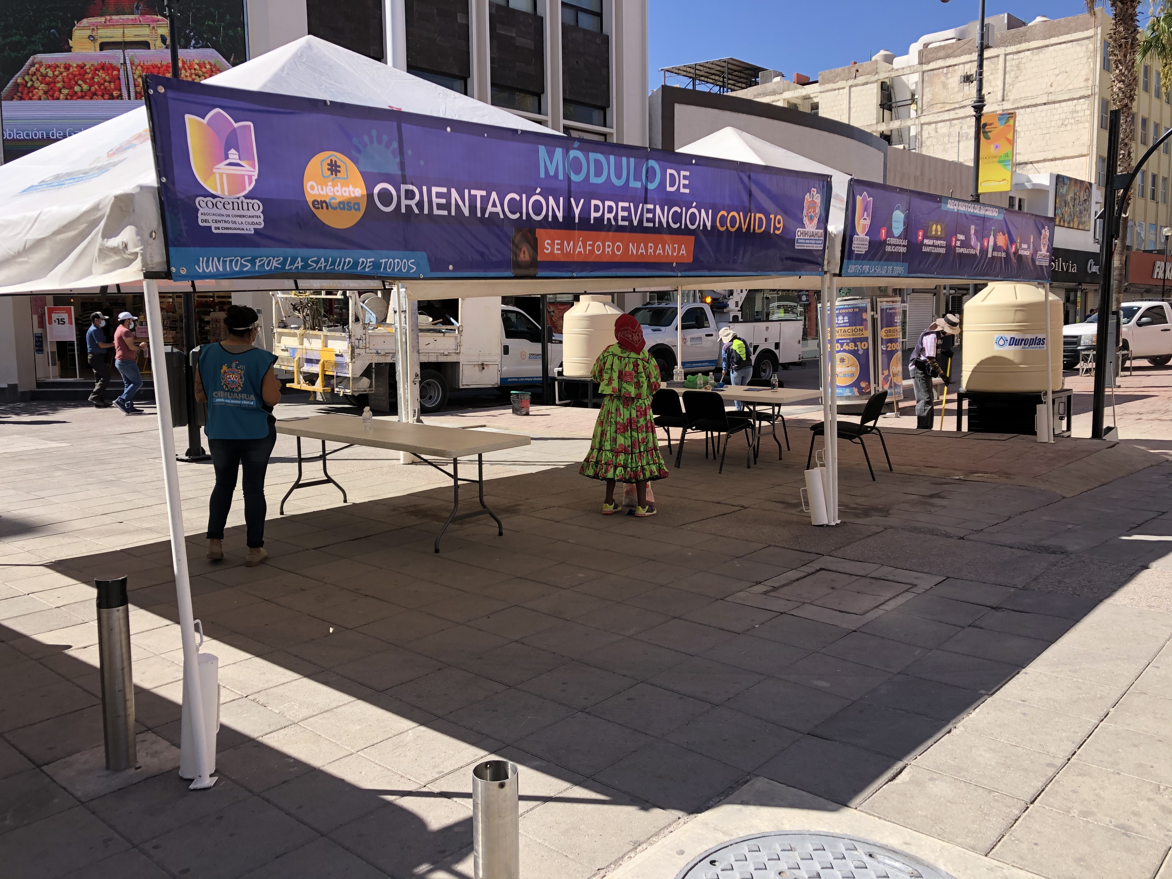 En cada filtro se tiene una carpa con personal que entrega cubreboca, gel antibacterial, toma la temperatura y vigila la afluencia de personas.
