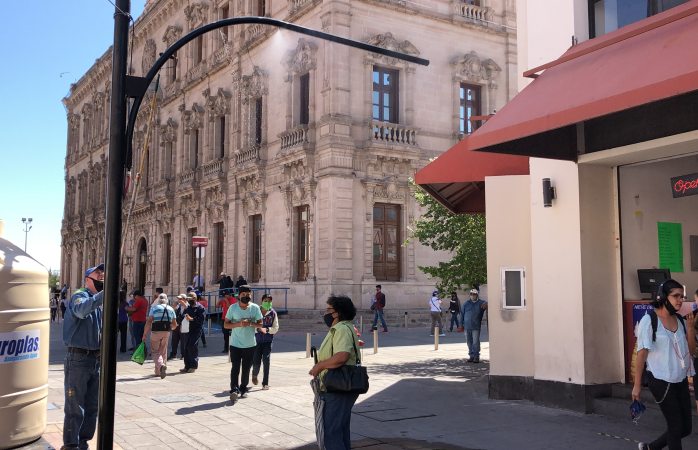Chihuahua.- Ocho filtros sanitizantes fueron instalados en el primer cuadro de la ciudad sobre las calles libertad Victoria.