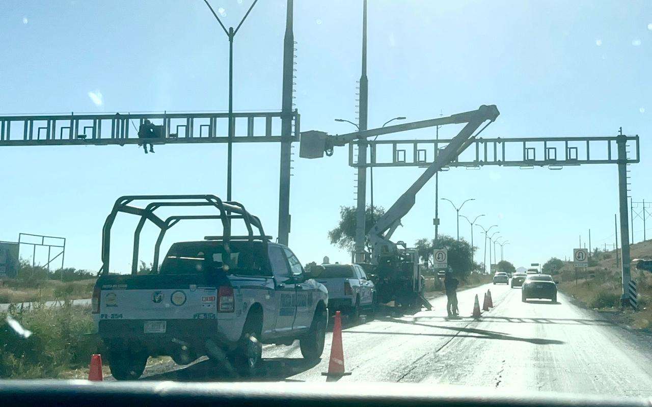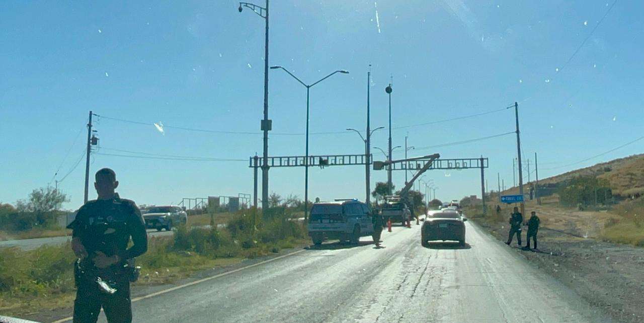 Bajo un fuerte dispositivo de seguridad, elementos de la SSPE resguardaron al personal que trabajó en la salida de Ciudad Aldama, donde se inició la colocación del nuevo arco centinela bajo la estricta vigilancia de agentes estatales.