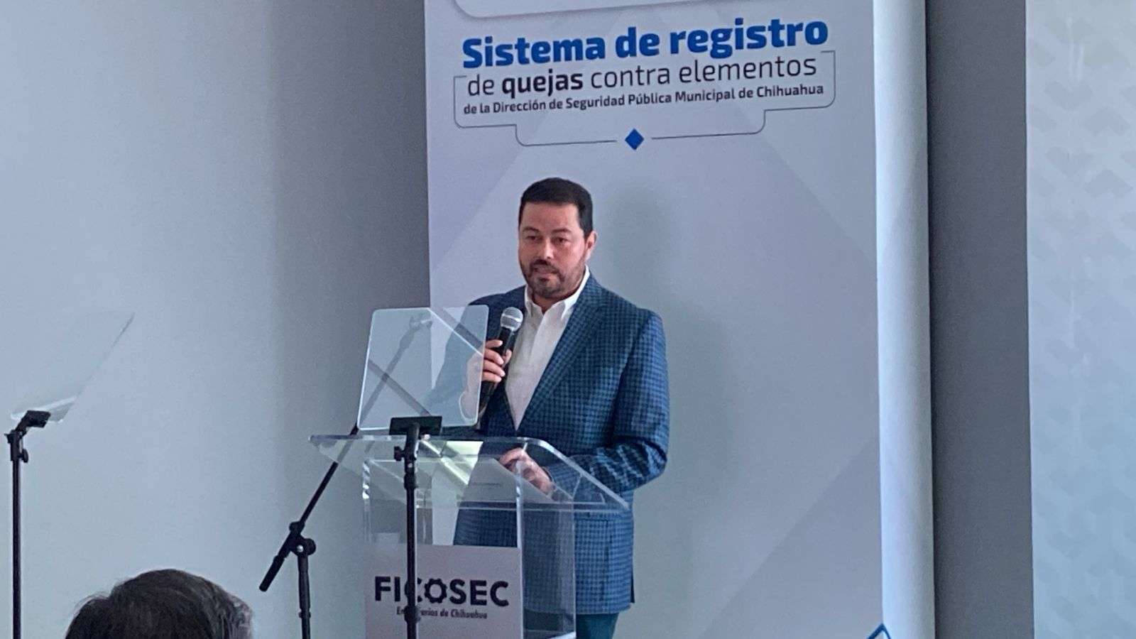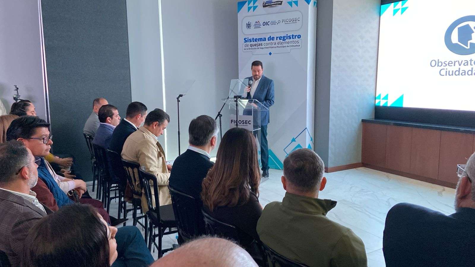 Chihuahua.- El alcalde Marco Antonio Bonilla Mendoza y el presidente estatal de Ficosec, Rodrigo Tema Cruz, presentaron el nuevo Sistema de Recepción de Quejas contra elementos de la Policía Municipal, una plataforma diseñada para automatizar y organizar los expedientes de denuncias ciudadanas, con el fin de darles seguimiento puntual y determinar si los elementos señalados deben ser sancionados.
