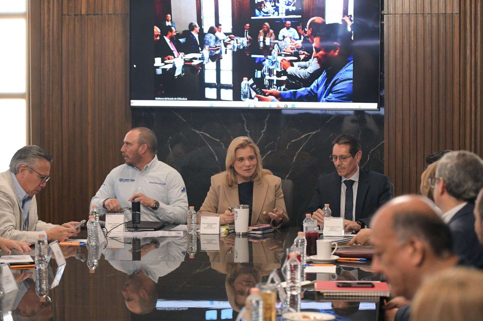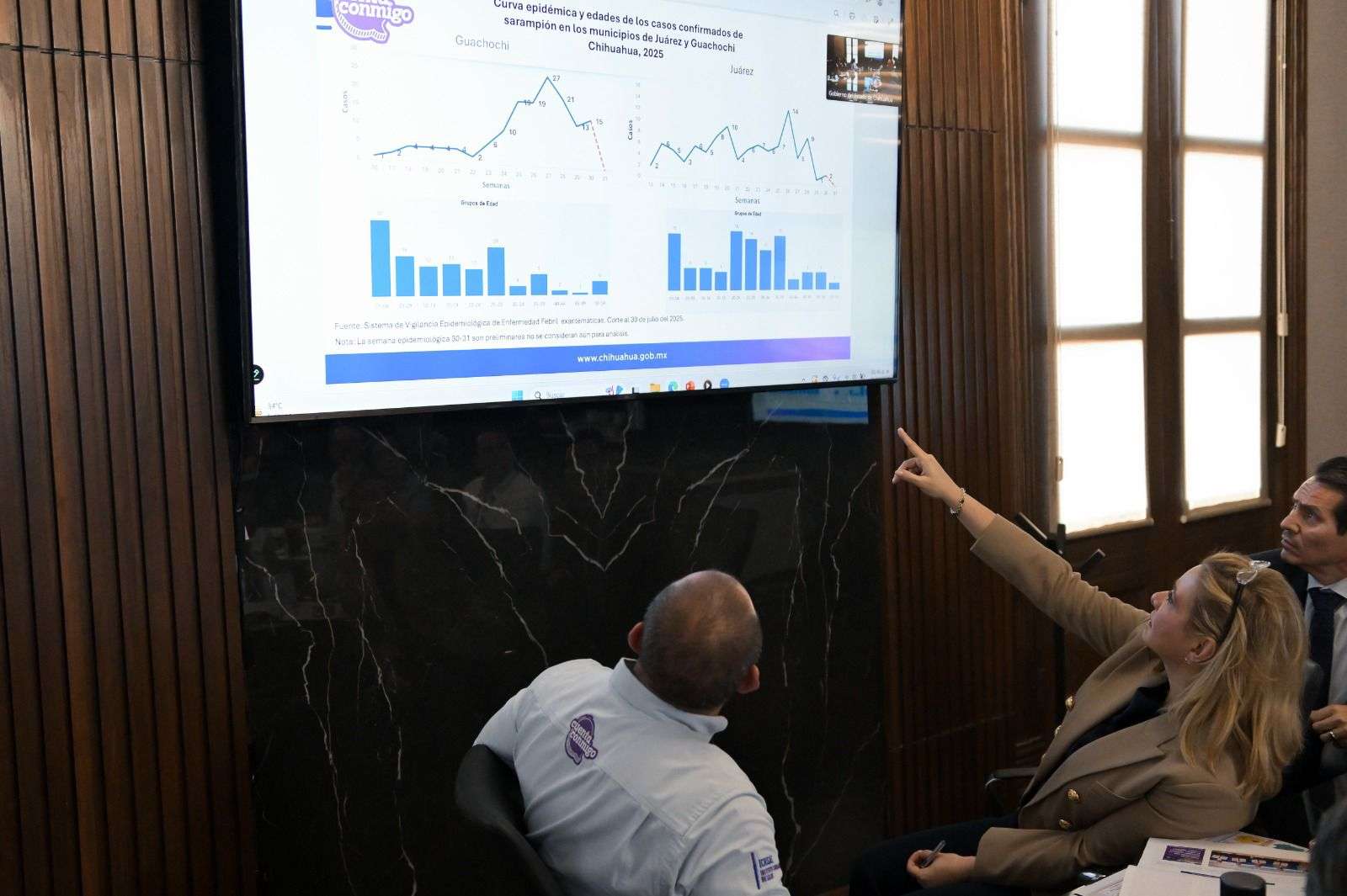 Chihuahua.- En sesión de trabajo con miembros de su gabinete, la gobernadora Maru Campos los llamó a que, cada uno desde su ámbito de influencia, intensifiquen las acciones de la estrategia que Gobierno del Estado emprende contra el sarampión en la entidad.