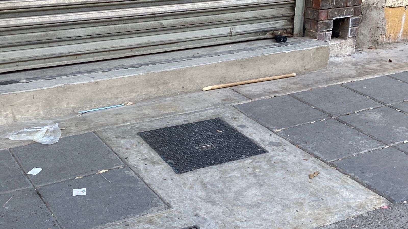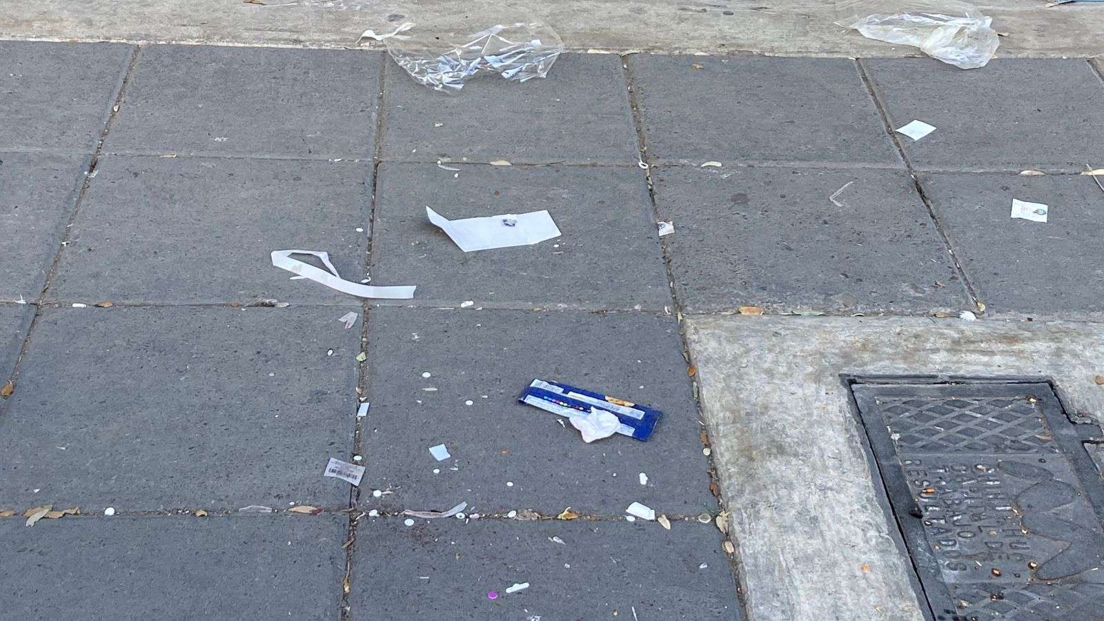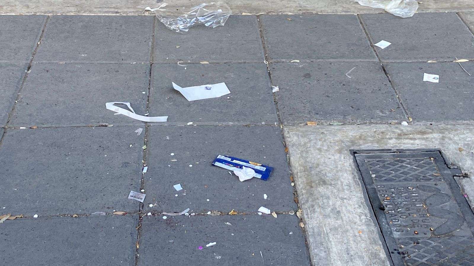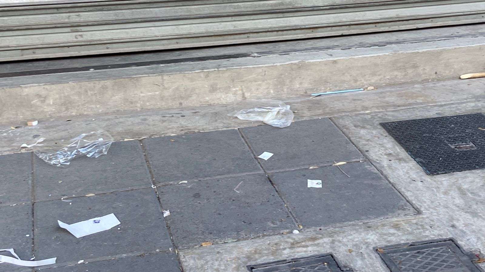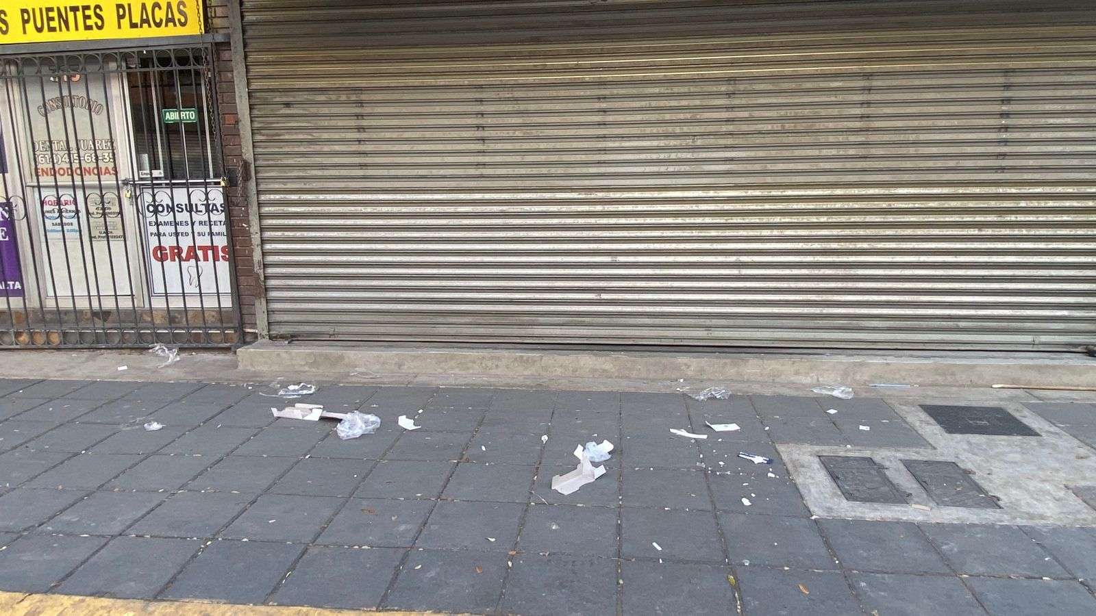 La basura observada en las calles del primer cuadro de la ciudad consistía en cartones, envoltorios plásticos y otros desechos esparcidos por la vía pública.