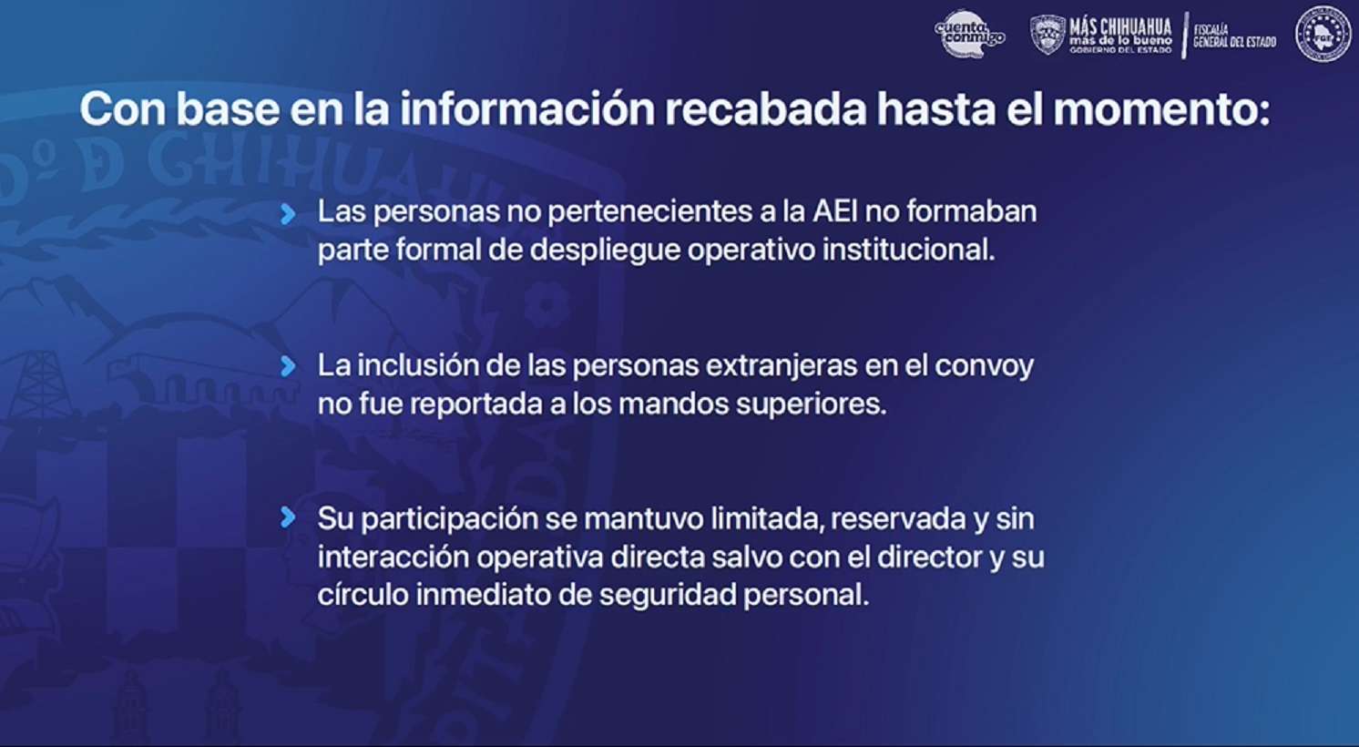 Chihuahua.- La encargada de la Unidad Especializada para la Investigación de los Hechos del Narco Laboratorio en Morelos, Wendy Chávez Villanueva, presentó una actualización detallada sobre las investigaciones del operativo en el municipio de Morelos, revelando que el fallecido director de la Agencia Estatal de Investigación (AEI), Pedro Román Oseguera Cervantes, integró a cuatro ciudadanos estadounidenses al convoy oficial de manera reservada y sin autorización de sus superiores y, por tanto, no actuaron en disposición de mando, coordinación ni ejecución de actos de autoridad.