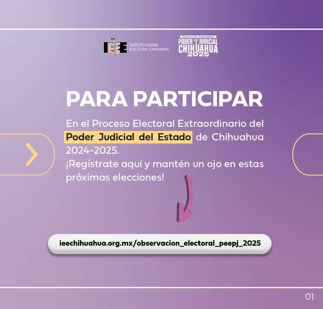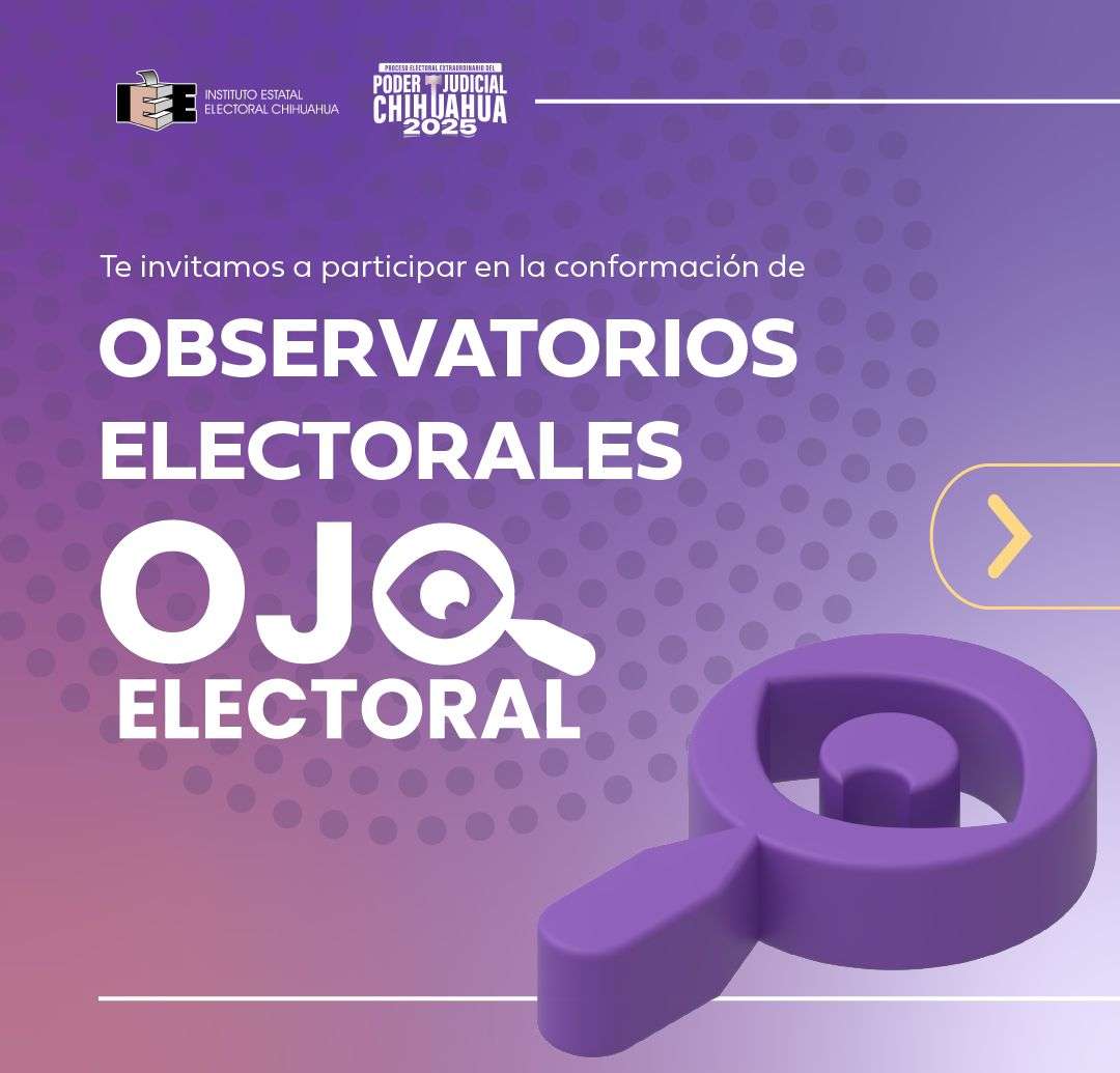 Chihuahua.- El Instituto Estatal Electoral de Chihuahua (IEE) invita a la ciudadanía a sumarse como persona observadora electoral en el Proceso Electoral Extraordinario 2024-2025 del Poder Judicial, para ser parte esencial de un acontecimiento inédito en el estado de Chihuahua, en el que, por primera vez, la población elegirá a magistraturas y juezas y jueces.
