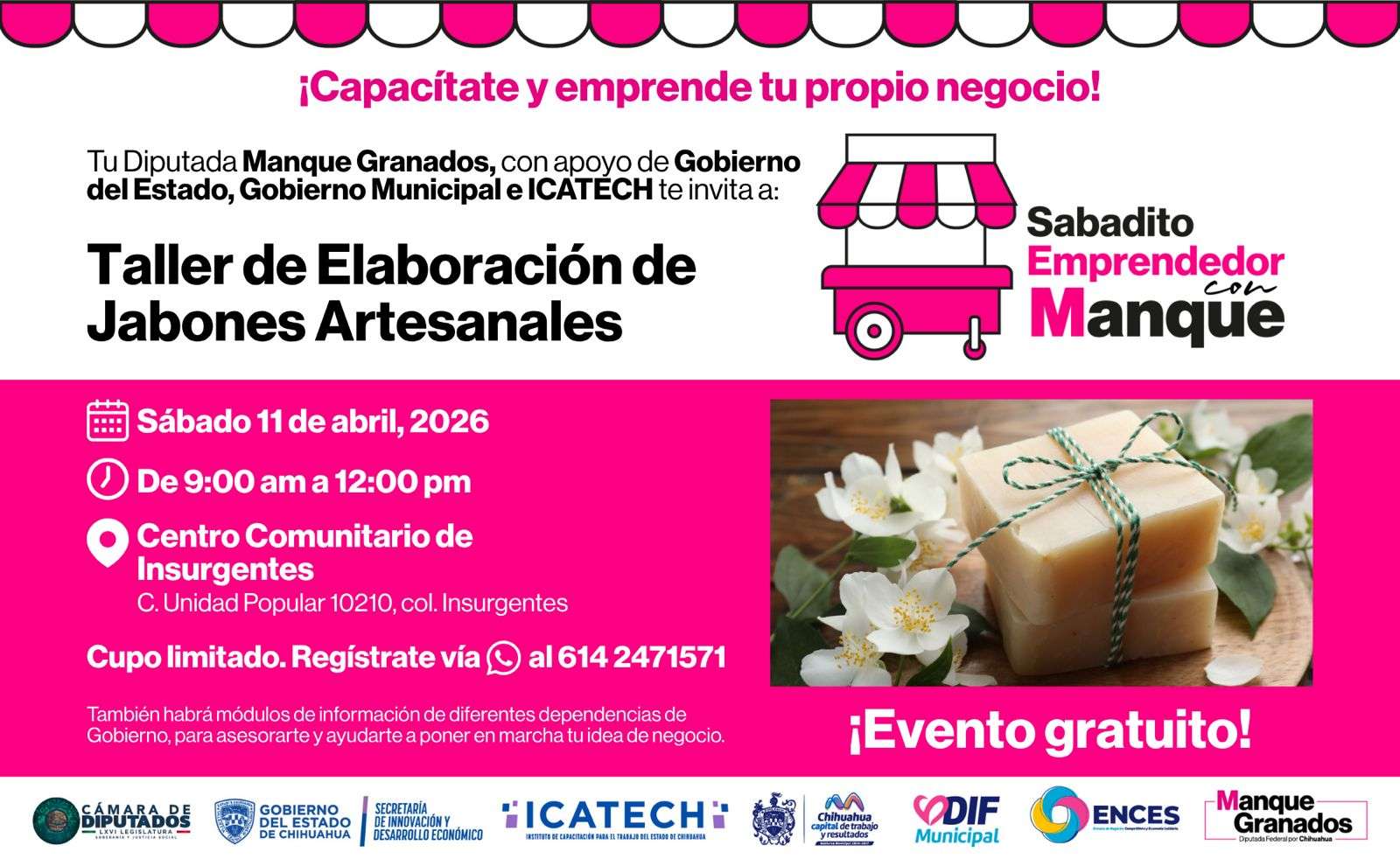 Chihuahua.- Con el objetivo de impulsar el emprendimiento y fortalecer la economía familiar en Chihuahua Capital, la diputada federal Manque Granados invita a los vecinos de Insurgentes, Deportistas, y colonias aledañas, a la tercera edición del programa “Sabadito Emprendedor”, que ofrecerá una capacitación gratuita de jabones artesanales.