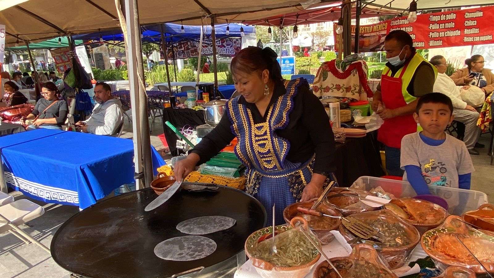 Enfrente de Catedral fue instalada una carpa donde están ofreciendo sopes, quesadillas, gorditas, tlacoyos y huaraches de masa azul de chicharrón prensado, tinga, huitlacoche, bisteck a la mexicana, champiñón, nopalitos, huitlacoche, pollo entomatado.
