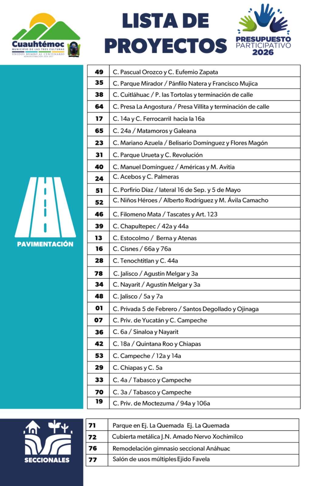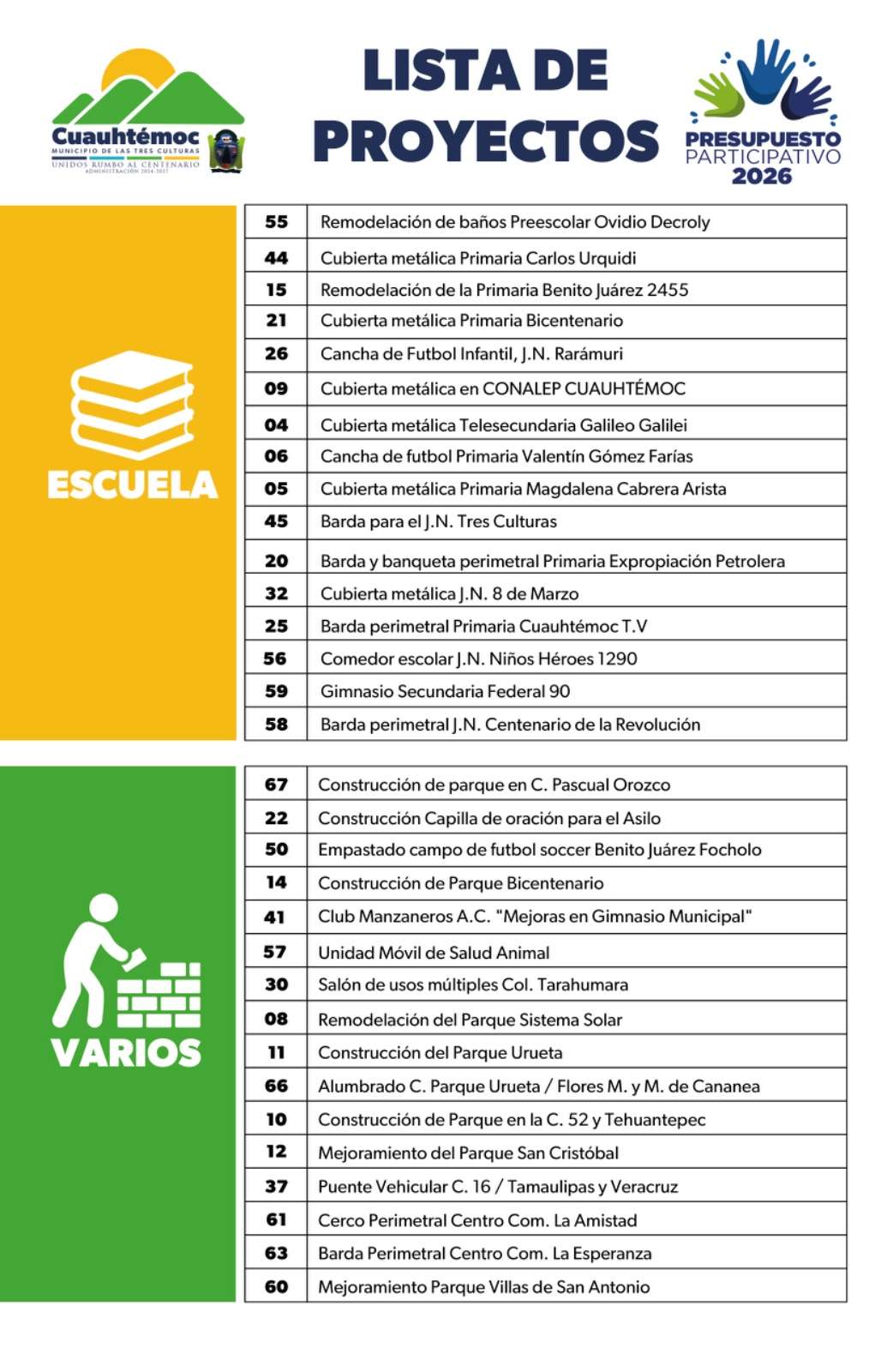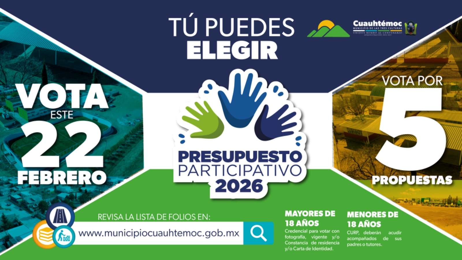 Cuauhtémoc.- El Gobierno Municipal de Cuauhtémoc invitó a la ciudadanía a participar en la jornada de votación del Presupuesto Participativo, que se realizará el domingo 22 de febrero, en un horario de 9:00 de la mañana a 6:00 de la tarde.