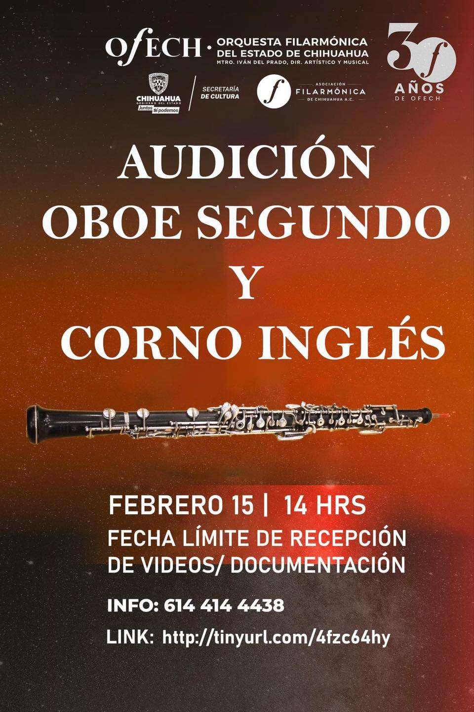 Chihuahua.- La Secretaría de Cultura invita a músicos instrumentistas de Oboe Segundo y Corno Inglés, a participar en las audiciones convocadas para cubrir dos vacantes de la Orquesta Filarmónica del Estado de Chihuahua (OFECh); fecha límite al 15 de febrero.