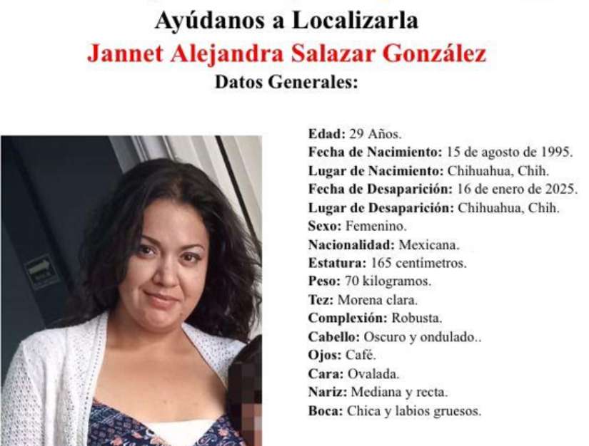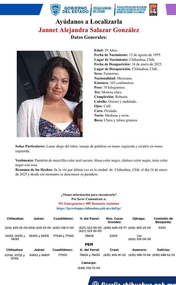 Chihuahua.- Jannet Alejandra Salazar González, de 29 años, desapareció este jueves 16 de enero en la ciudad de Chihuahua.