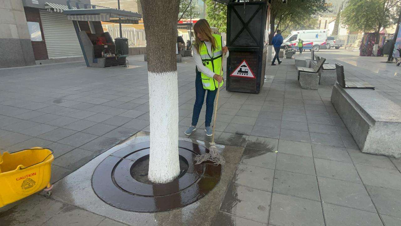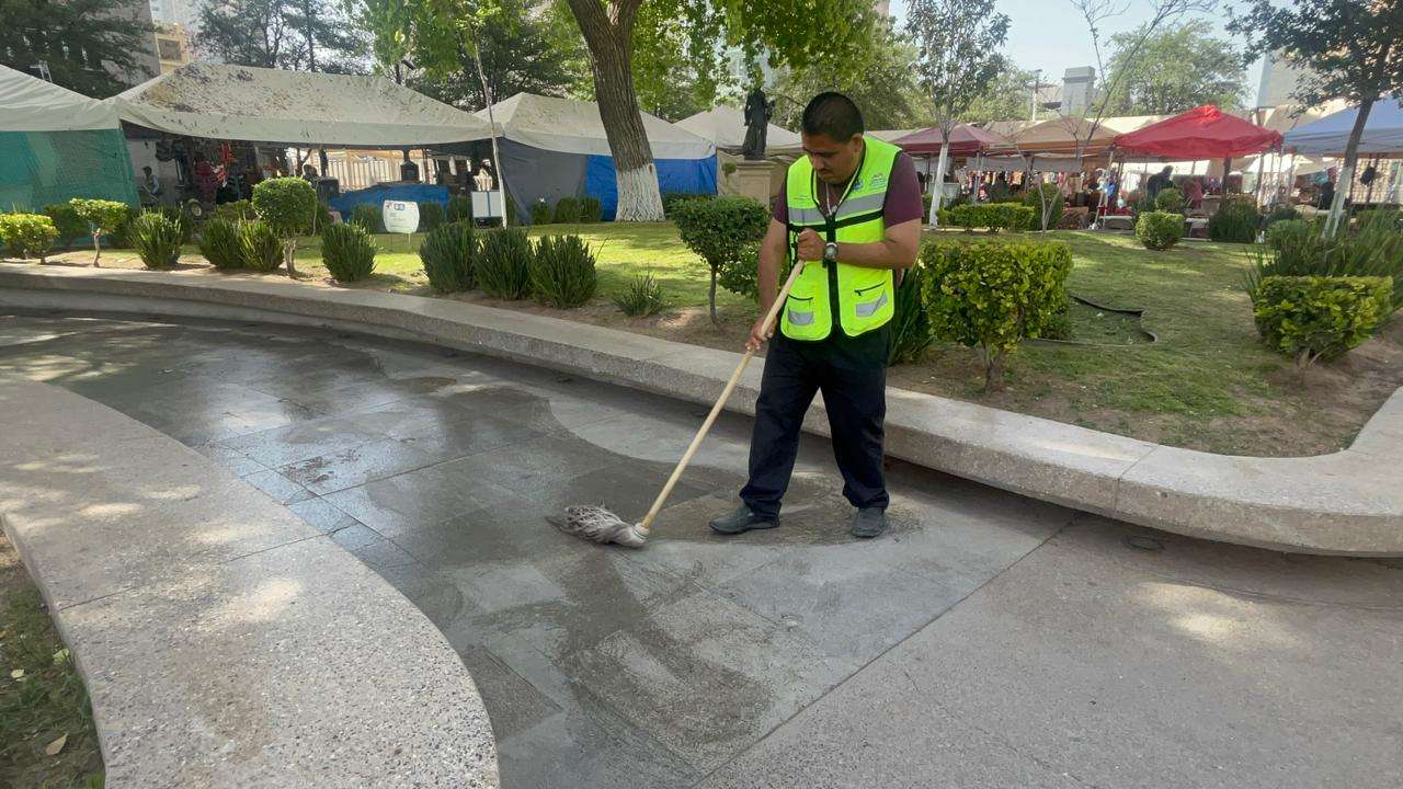 Lo anterior debido a la capa de polvo y tierra que cubría los monumentos, bancas y quiosco de la Plaza de Armas.