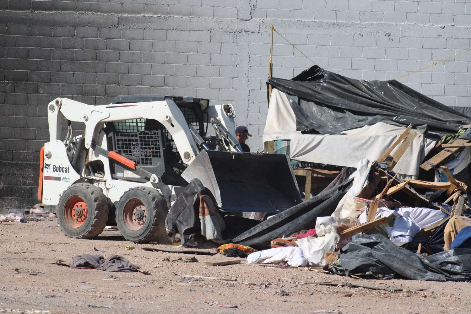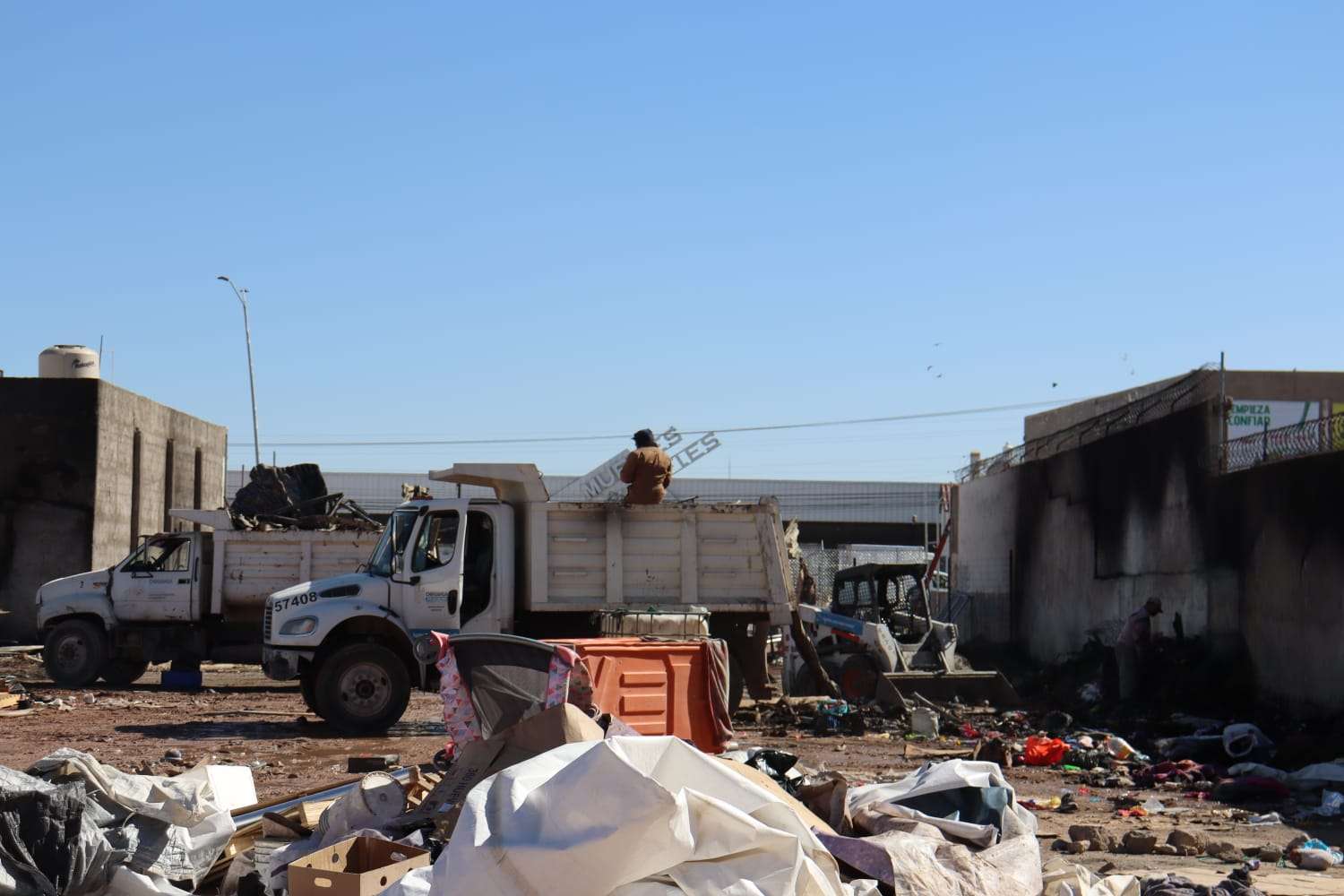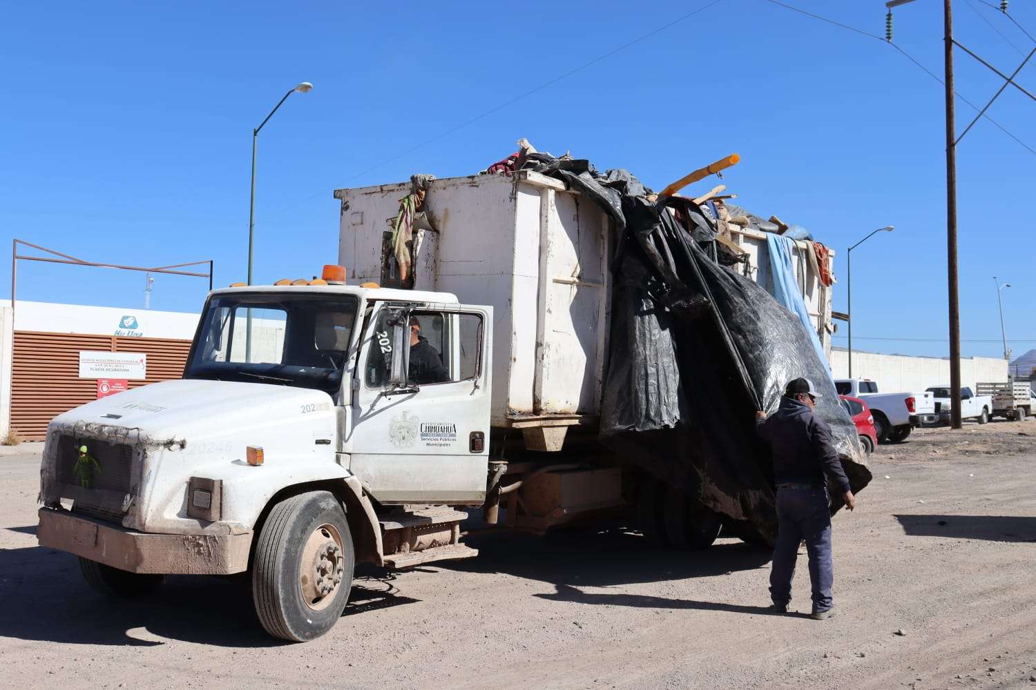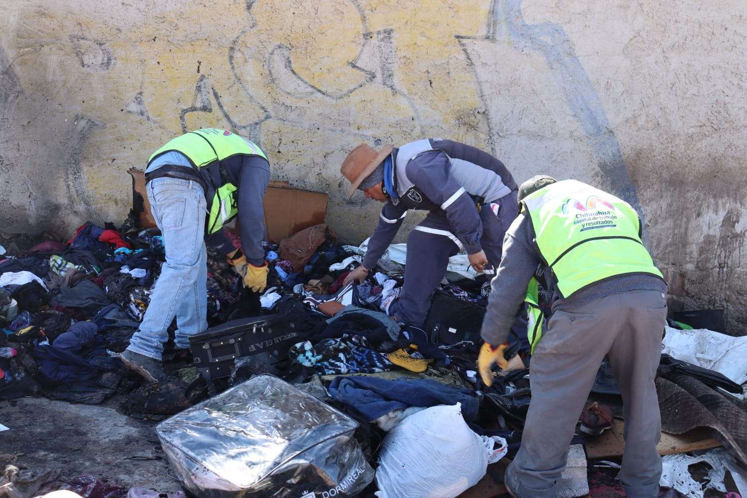 Chihuahua.- El Gobierno Municipal, a través de las direcciones de Servicios Públicos Municipales y Mantenimiento Urbano, llevo a cabo un operativo en conjunto de limpieza en un terreno donde se alojaban migrantes, ubicado al sur de la ciudad.