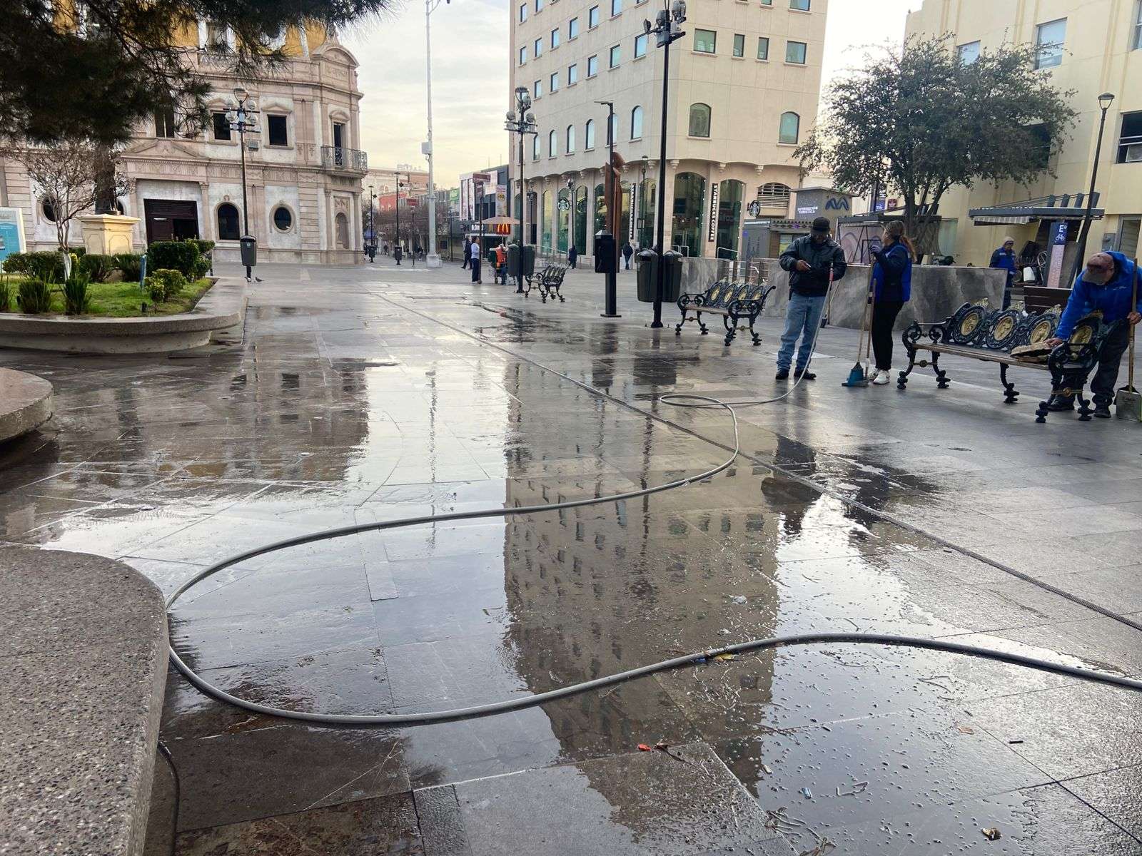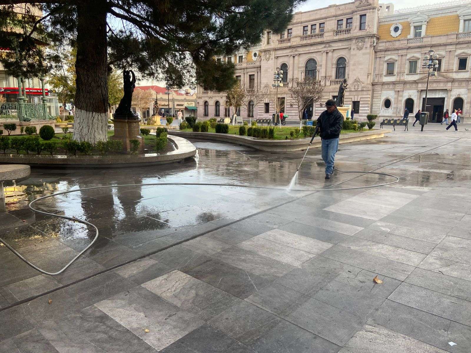 Chihuahua.– Una cuadrilla de trabajadores de la Dirección de Mantenimiento Urbano llevó a cabo labores de limpieza en la Plaza de Armas, específicamente en las calles Libertad y Victoria, con el objetivo de mantener en buen estado la imagen del centro histórico de la ciudad.