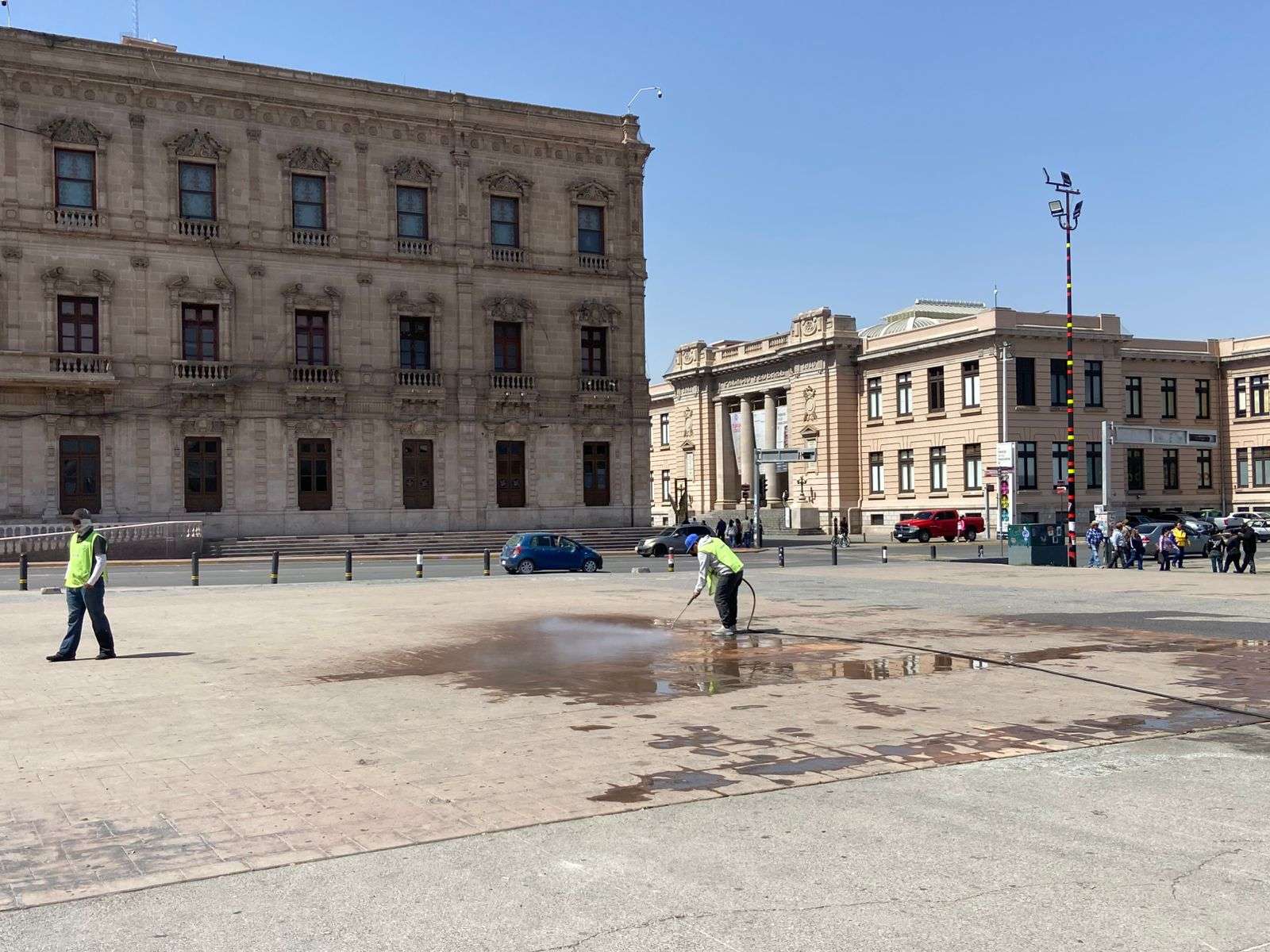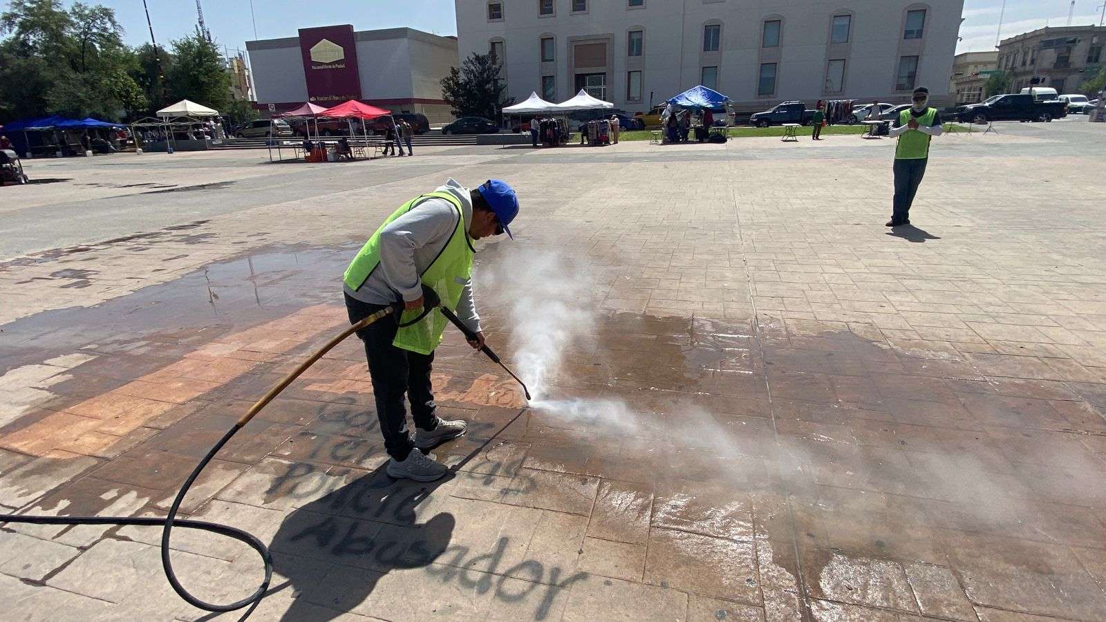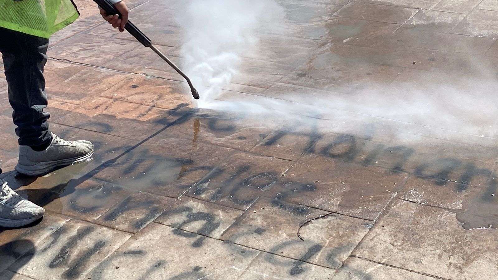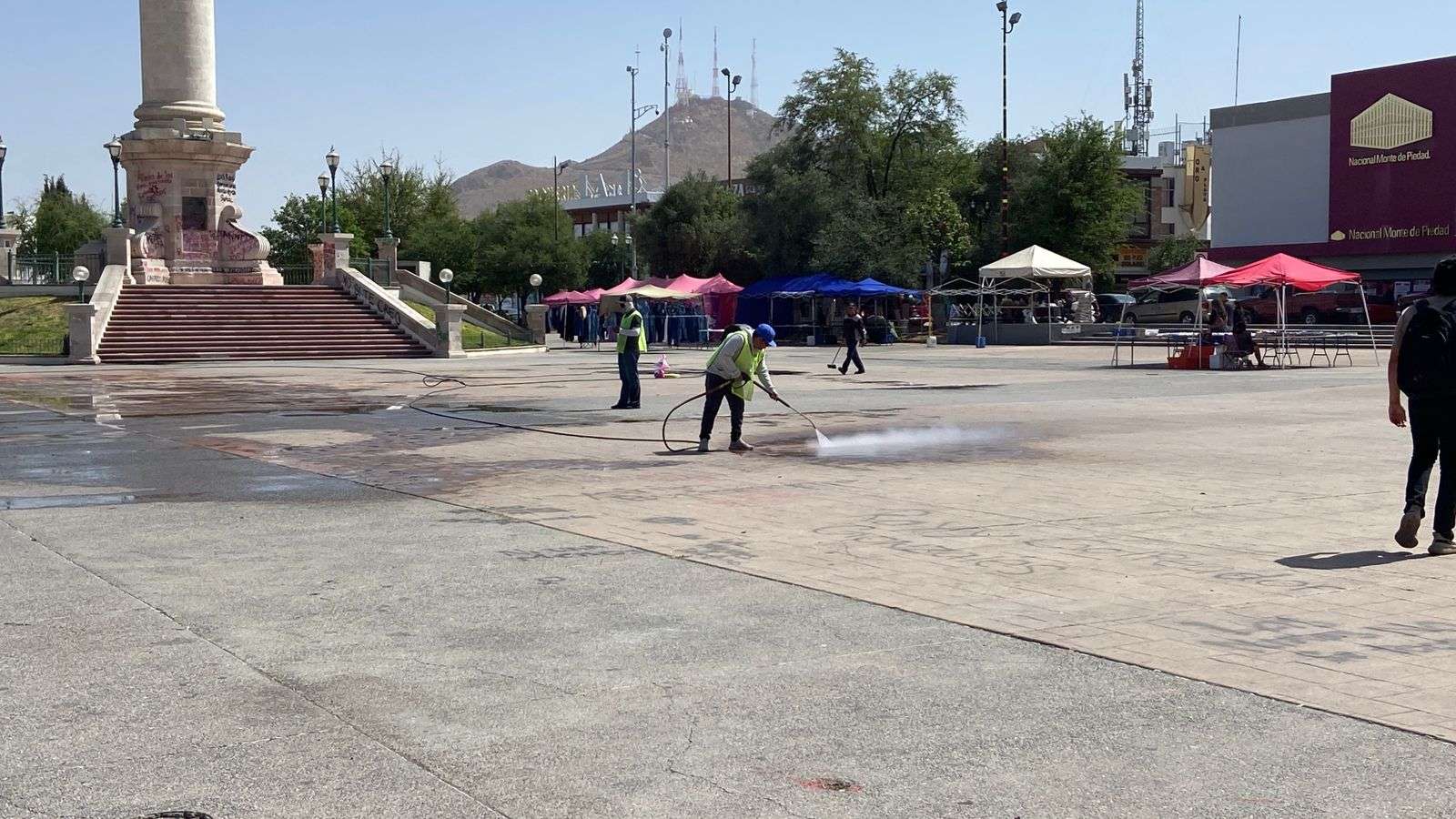 Chihuahua.- Trabajadores de la empresa Protec, se encargaron de limpiar los grafittis que aún se encuentran en la plancha de la Plaza del Ángel, esto después de la marcha del 8M.