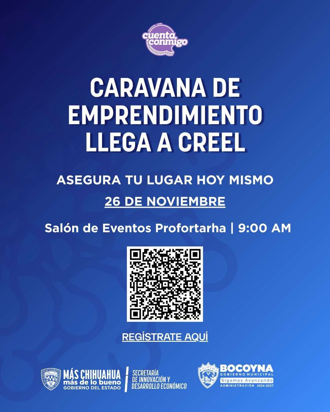 Chihuahua. - El Gobierno del Estado, a través de la Secretaría de Innovación y Desarrollo Económico (SIDE), llevará a Creel la Caravana de Emprendimiento este 26 de noviembre en el Salón de Eventos Profortarah a partir de las 9:00 horas, como parte de la estrategia Cuenta Conmigo.