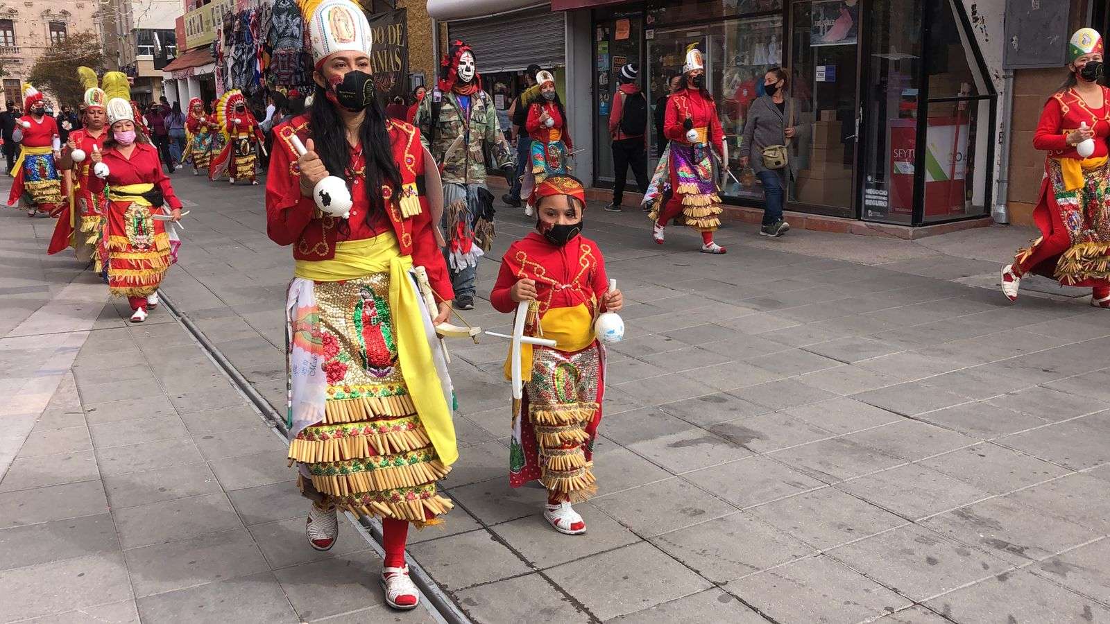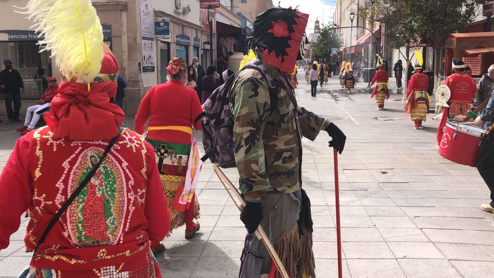 Chihuahua.- Como parte de su recorrido hacia el Santuario de la Virgen de Guadalupe, un grupo de matachines provenientes del Templo de a Santo Niño, llegaron al primer cuadro de la ciudad y al son de los tambores recorrieron la calle Victoria.