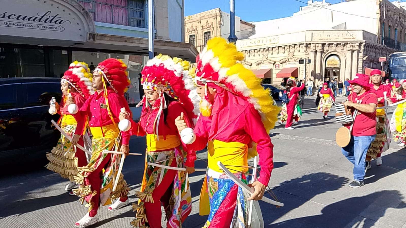 La peregrinación partió desde la calle Guadalupe Victoria, donde decenas de danzantes comenzaron su recorrido ataviados con penachos de plumas, listones y trajes bordados que brillaban bajo el sol.
