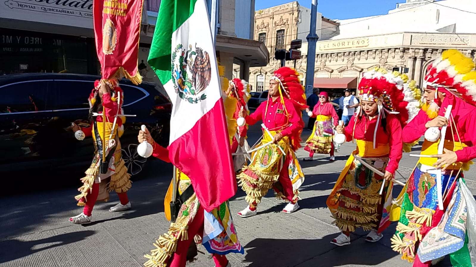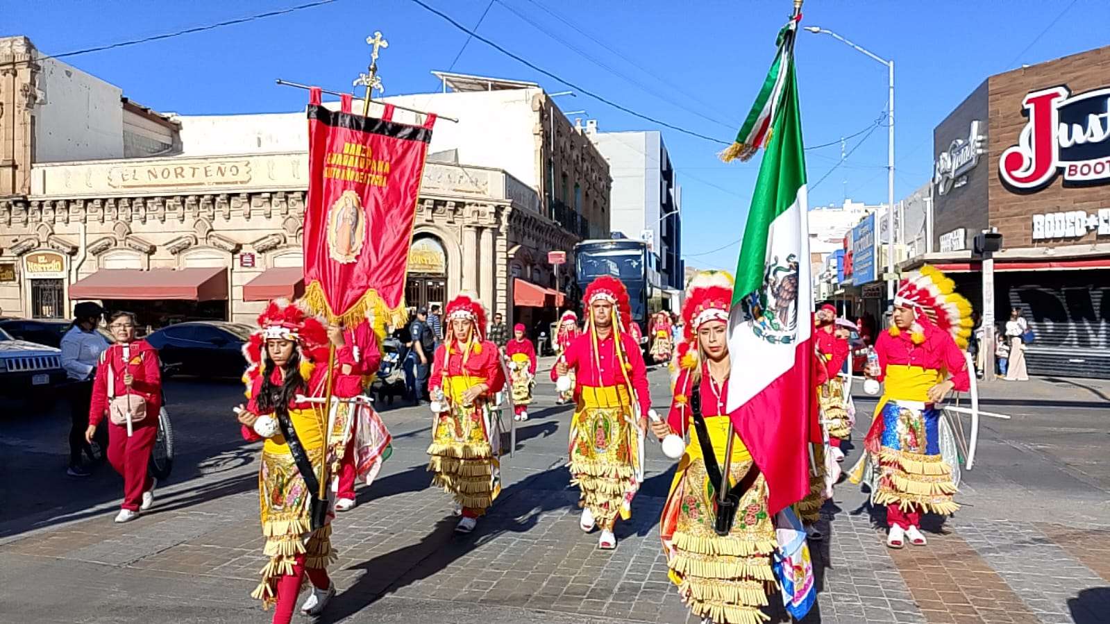 Chihuahua.- Entre el sonido de tambores y sonajas, los matachines de la Danza Guadalupana del Santo Niño de Atocha avanzaron esta mañana por las calles del centro, llevando su fe y su ritmo hacia la Basílica de Guadalupe.
