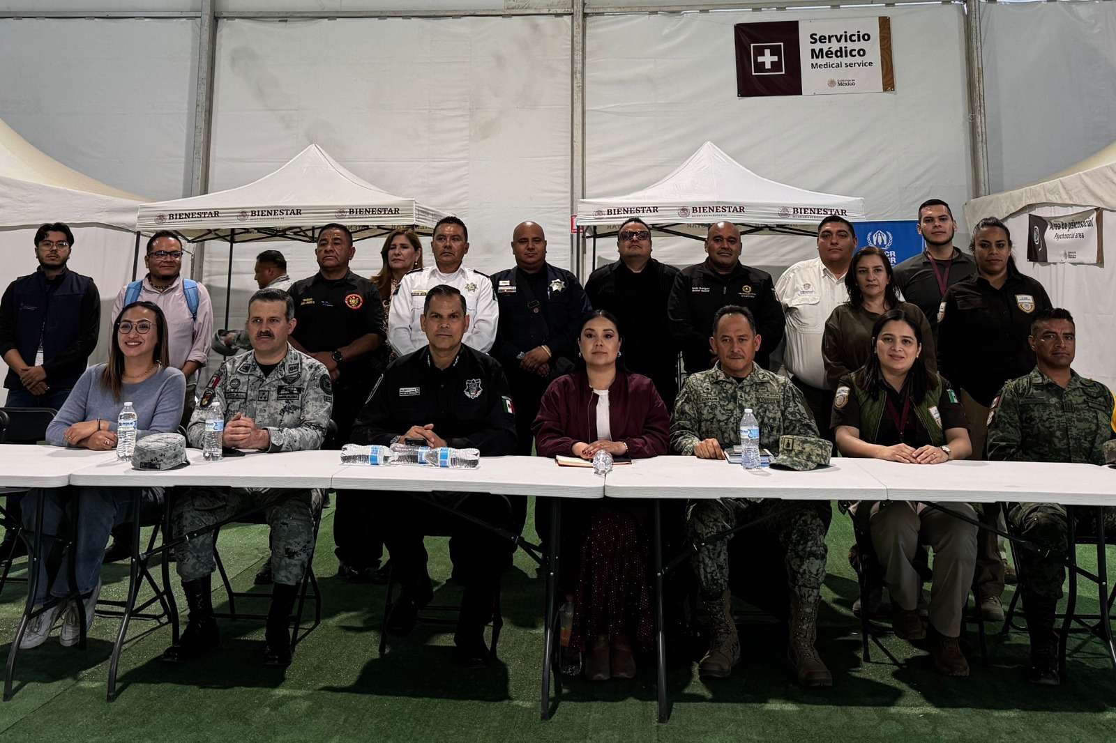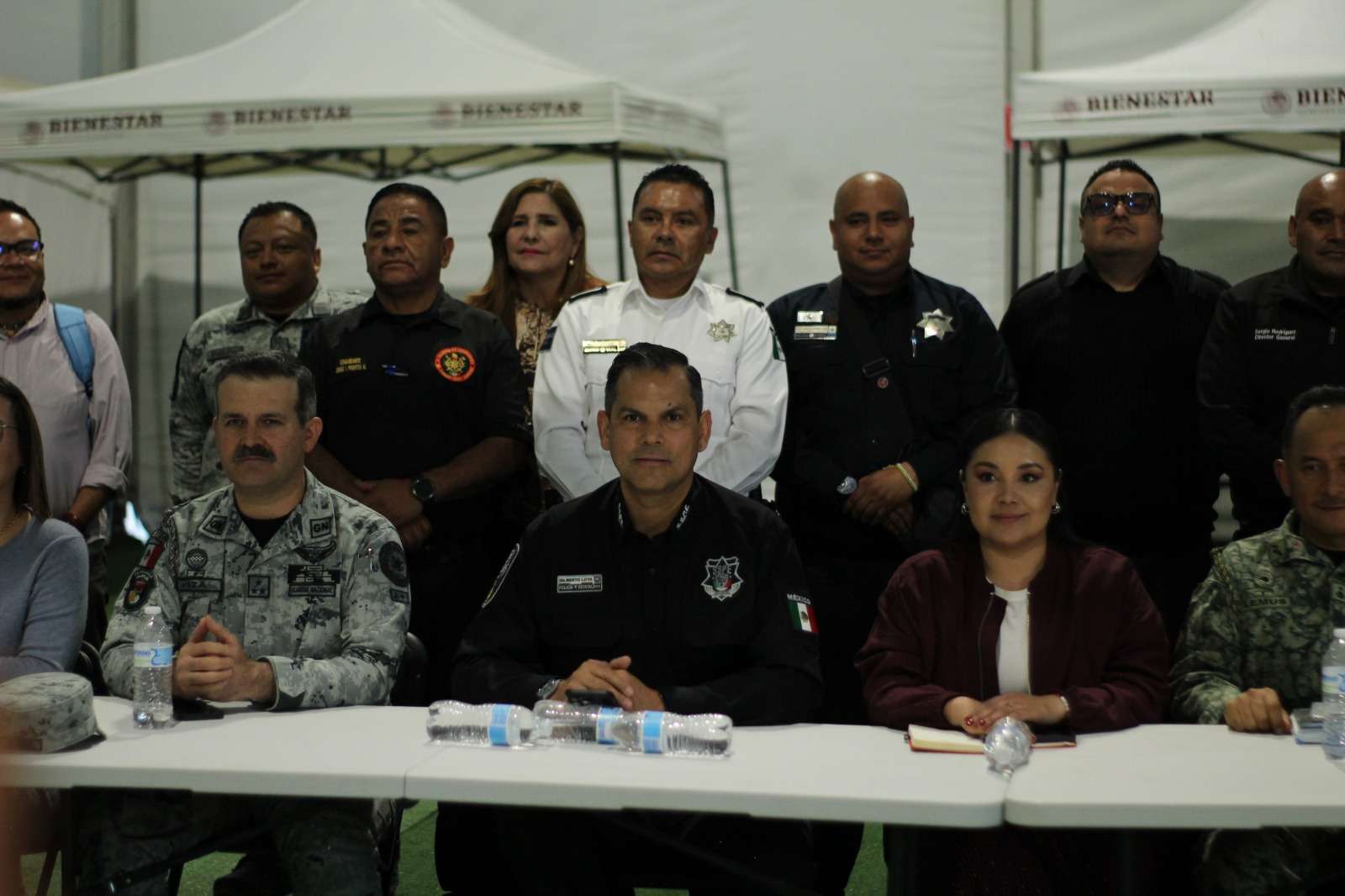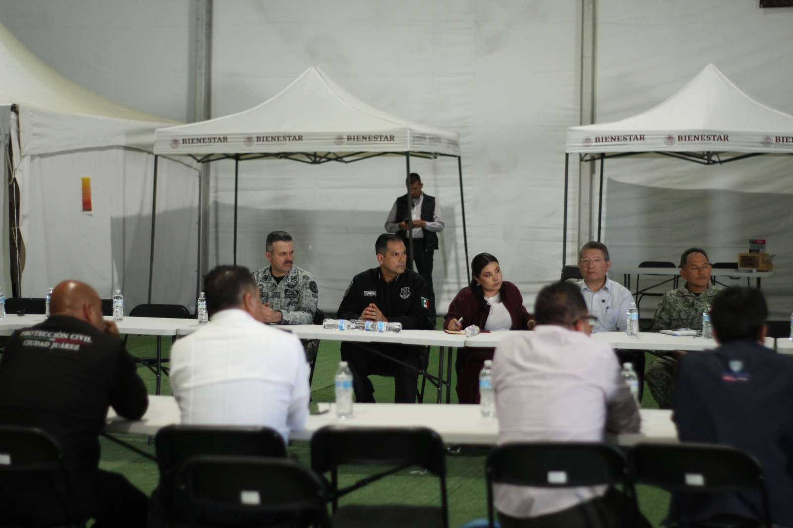 La reunión se llevó a cabo en la carpa de servicios del albergue de El Punto y contó con la participación de Mayra Chávez Jiménez, delegada de Bienestar en Chihuahua; Oscar Ibáñez, representante de la gobernadora en Ciudad Juárez; Sergio Rodríguez, director general de Protección Civil; Víctor Daniel Mejía, director operativo de Vialidad.