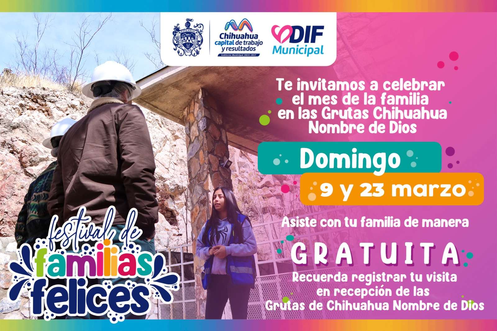 Chihuahua.- En el marco del mes de la familia y el Gobierno Municipal, a través del DIF, reitera a la ciudadanía en general que mañana 23 de marzo, es el último domingo de entrada gratis en las Grutas Nombre de Dios.