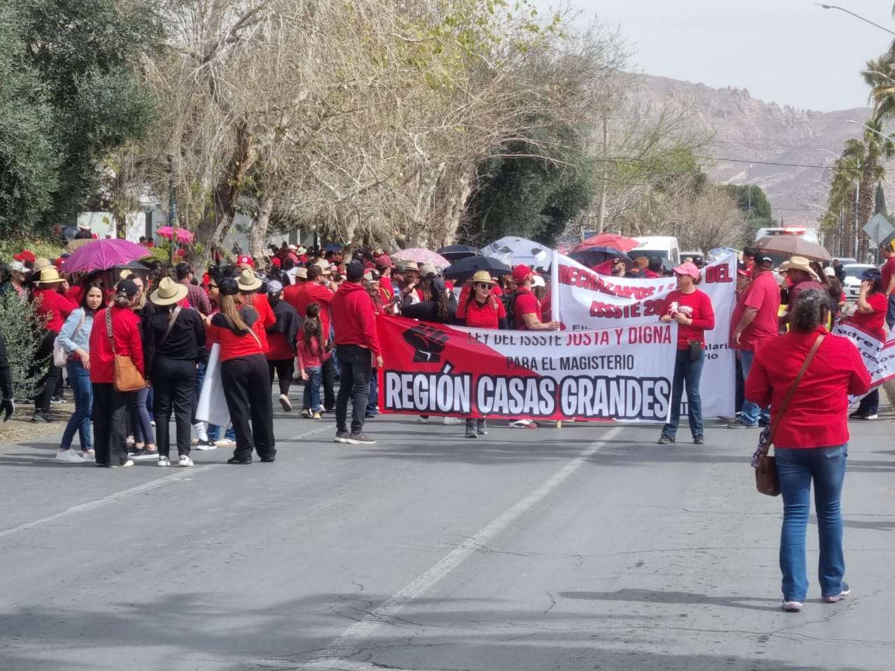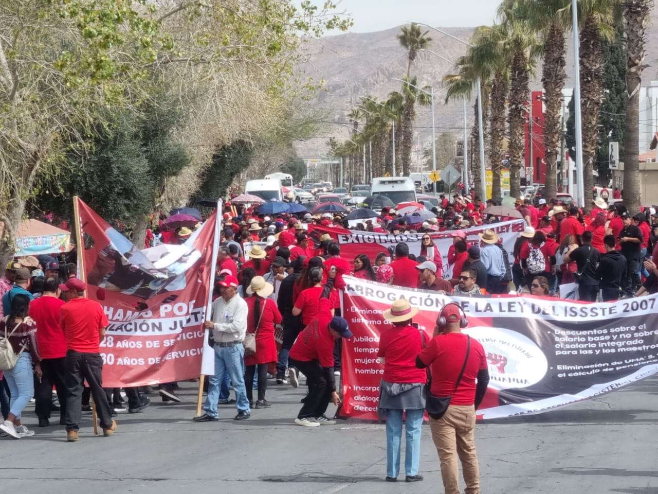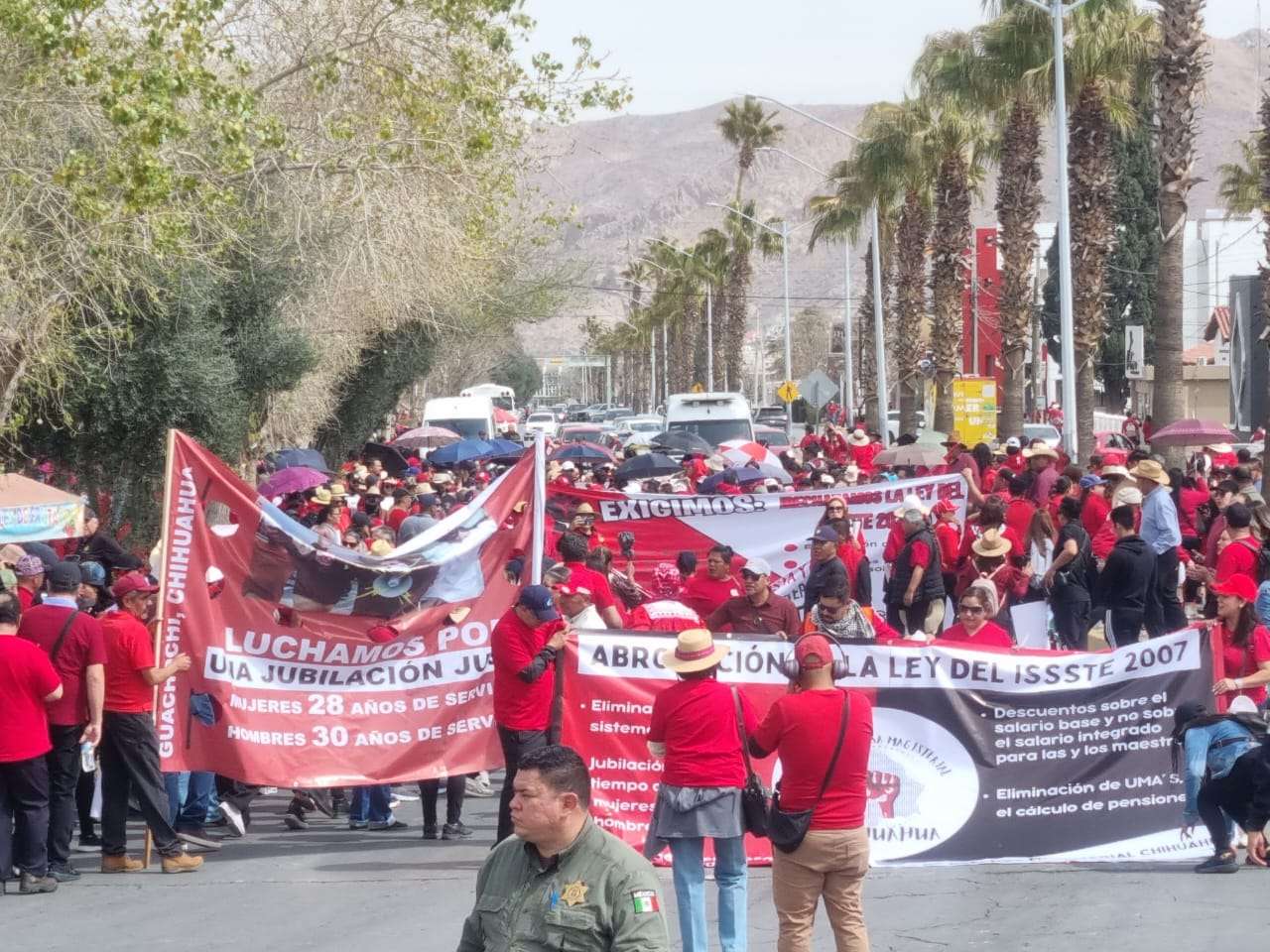 Chihuahua.- A poco más de las 12 del mediodía, comenzó la marcha de docentes provenientes de diversas zonas escolares del estado, principalmente de Parral, Chihuahua, Cuauhtémoc, Delicias, Ciudad Juárez, Casas Grandes, Guachochi y la zona serrana, entre otras, en protesta contro la reforma a la ley Issste.