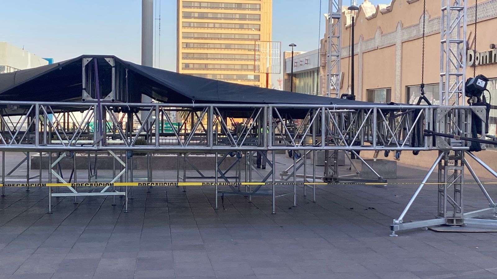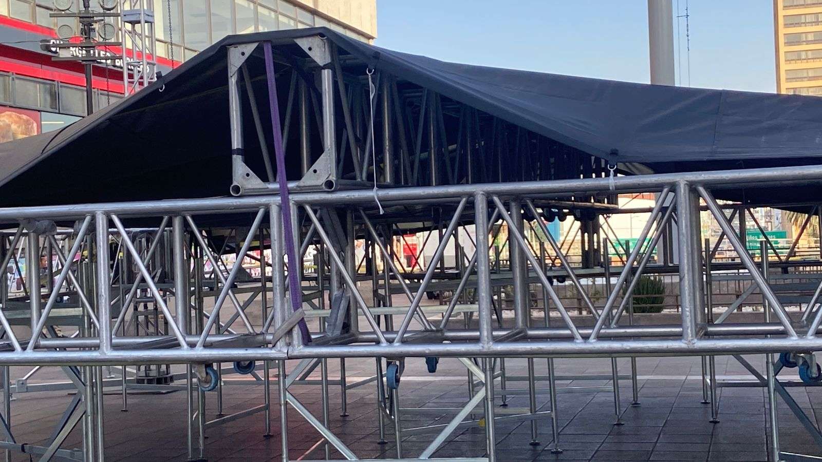 Se trata de un pequeño escenario, con un templete y una carpa que estará albergando a los grupos de danza que estarán participando en este evento.