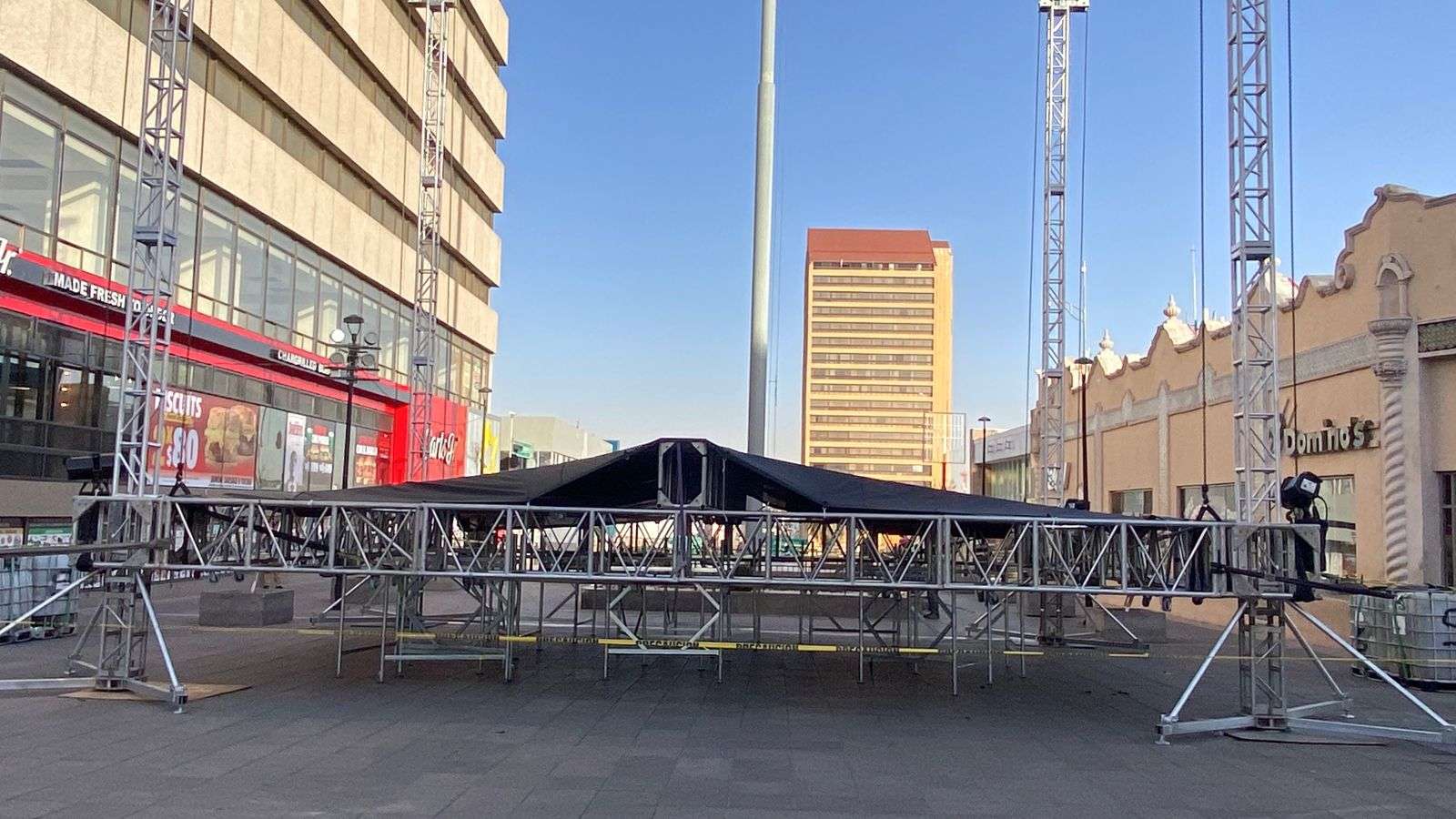 Chihuahua.- En la Plaza de Armas se montó un escenario donde se estará llevando a cabo el Festival Folclórico del 13 al 15 de marzo dónde estarán participando más de 3 mil 500 bailarines.