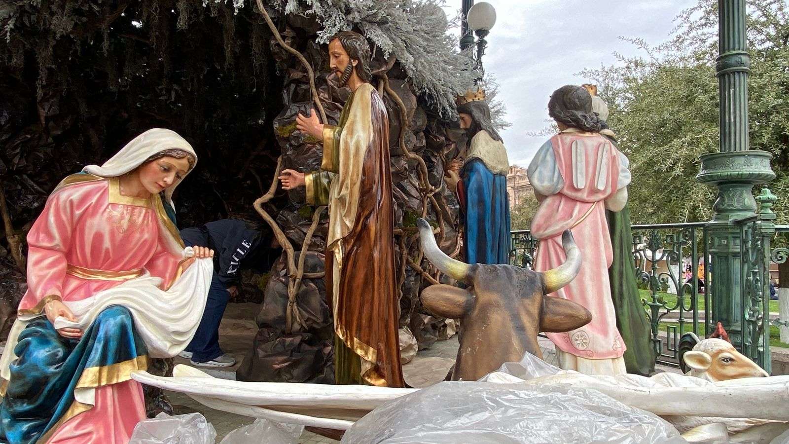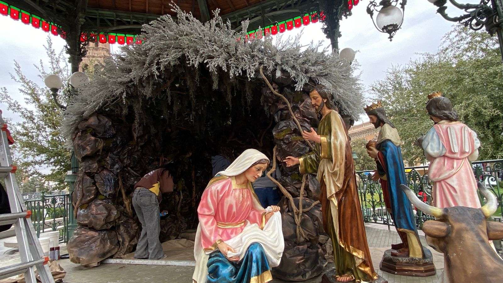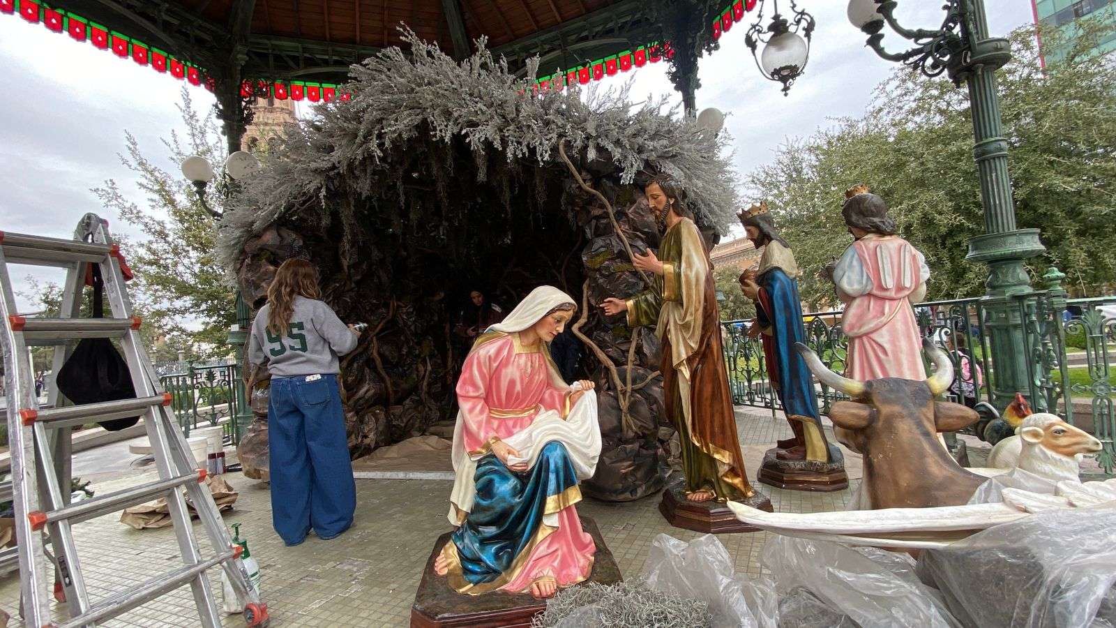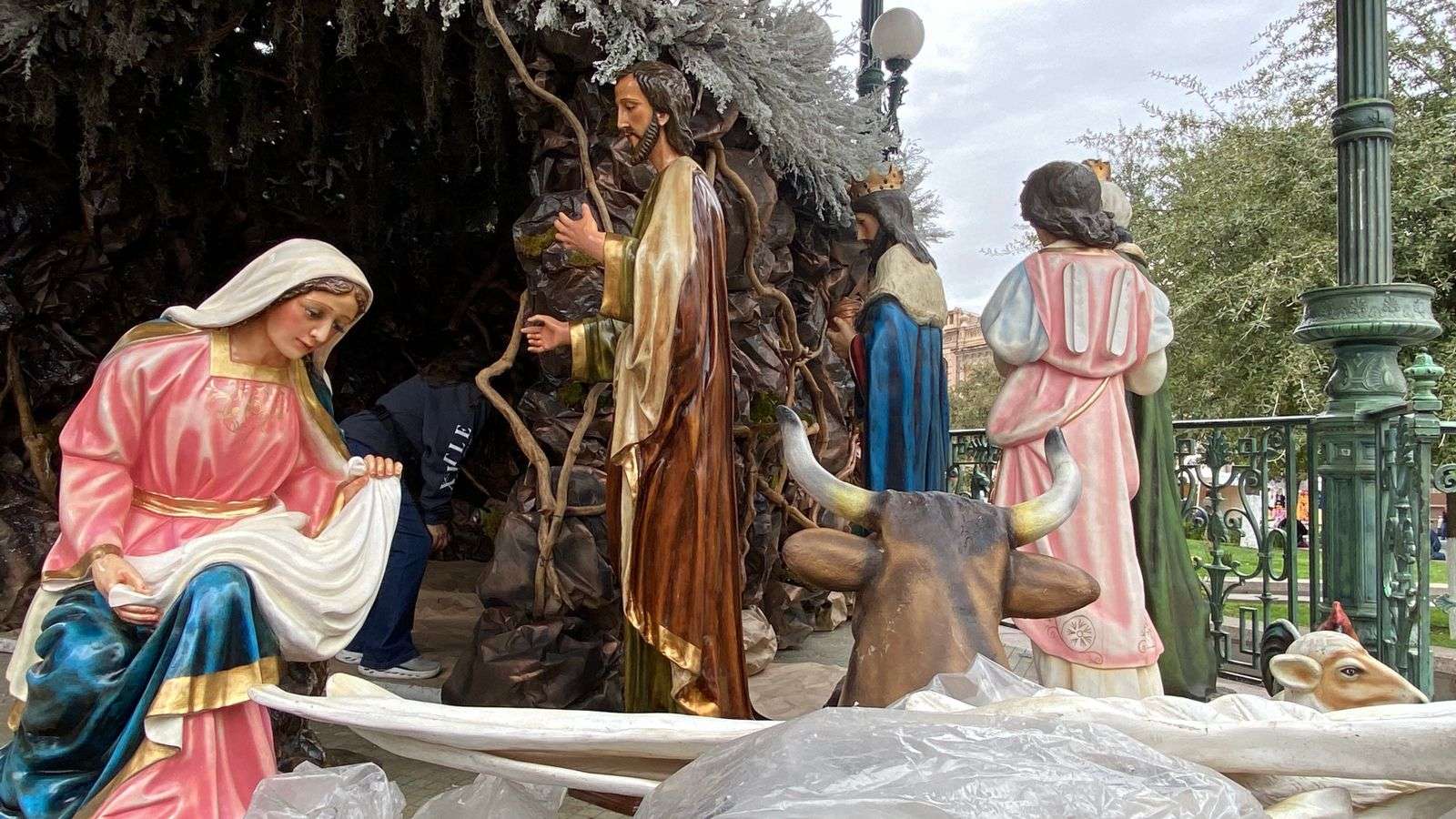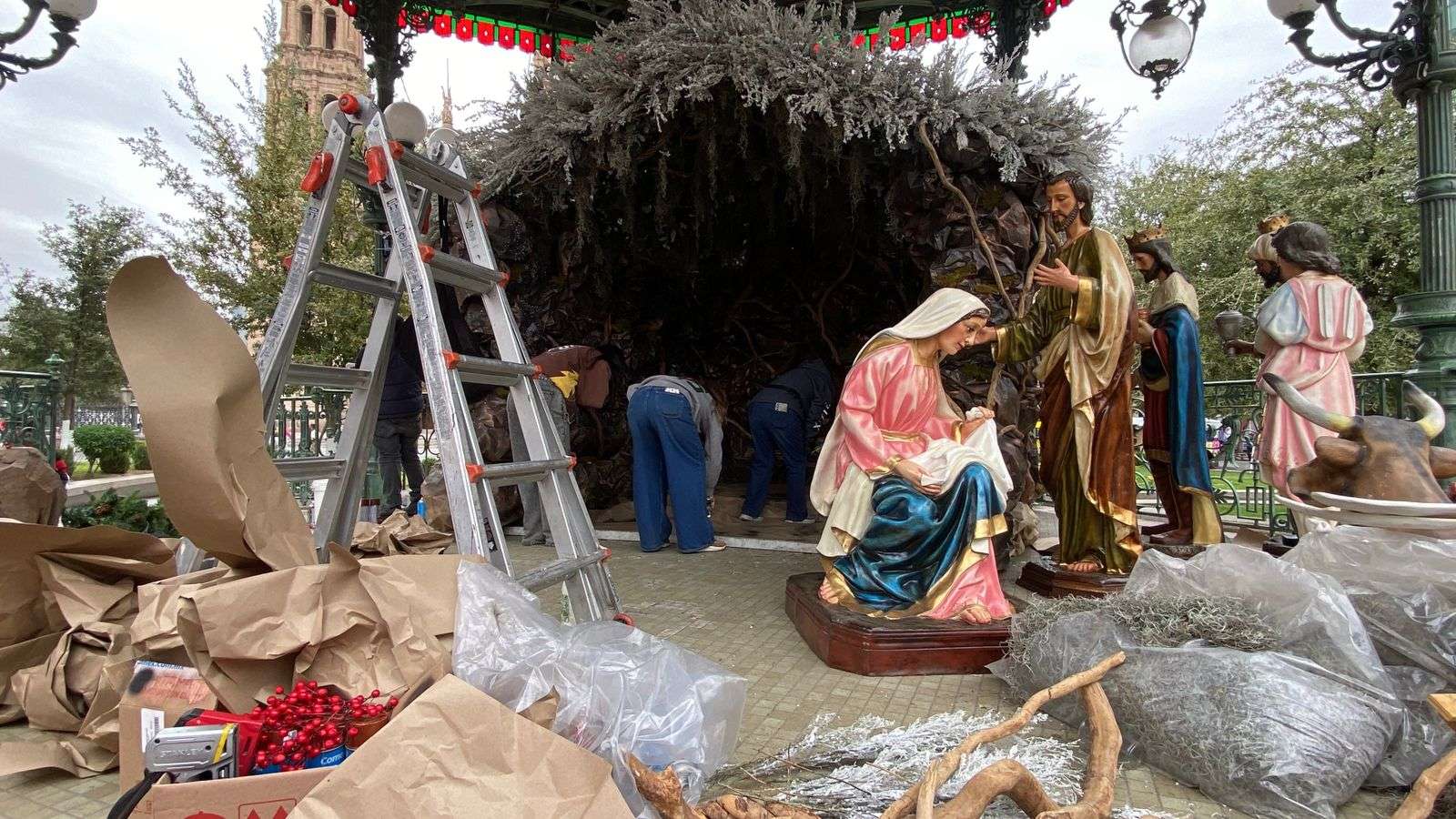 Chihuahua.- En el kiosko de la Plaza de Armas se ha colocado el nacimiento tradicional de tamaño natural por parte del municipio, para que todos los visitantes que acudan al centro puedan tomarse la foto.