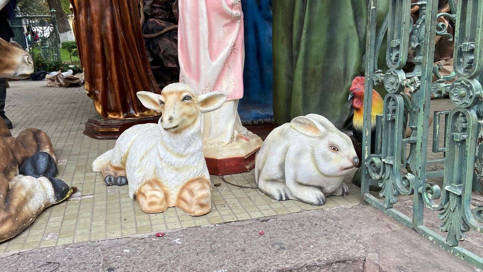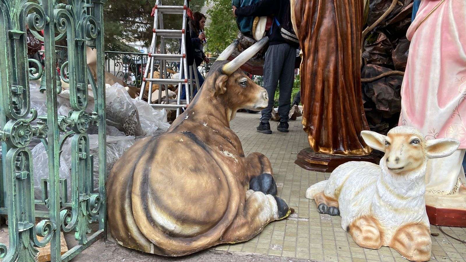 También se pueden ver un burro, un buey, un borrego y un conejo, figuras de tamaño natural que se encuentran siendo restauradas y pintadas para que queden listas para el encendido del árbol.