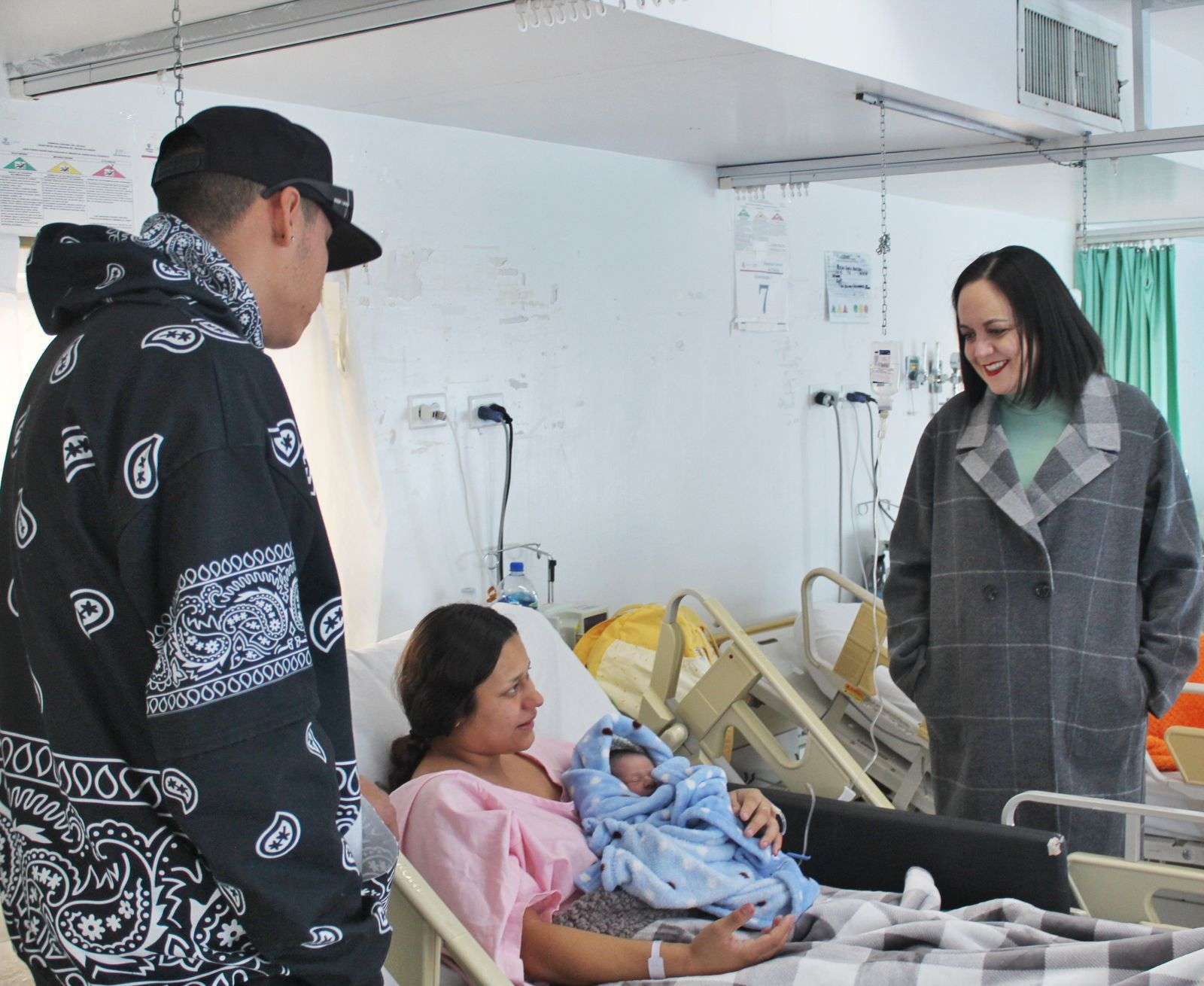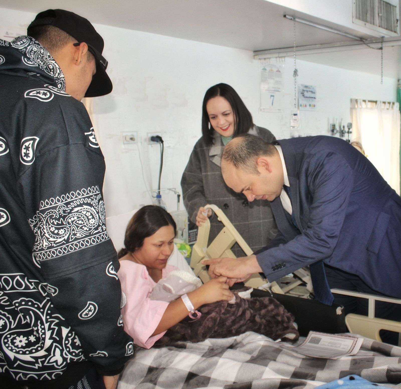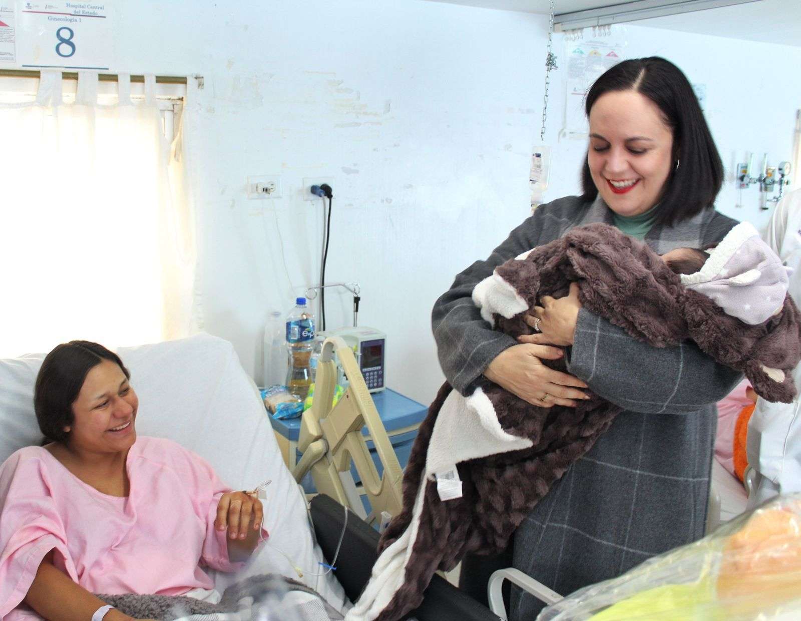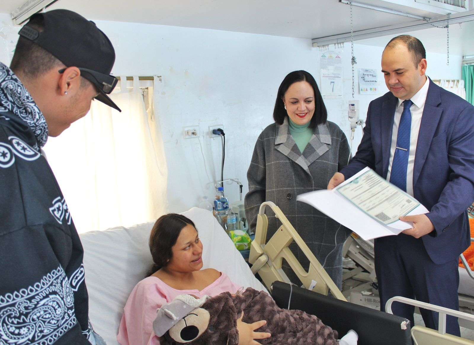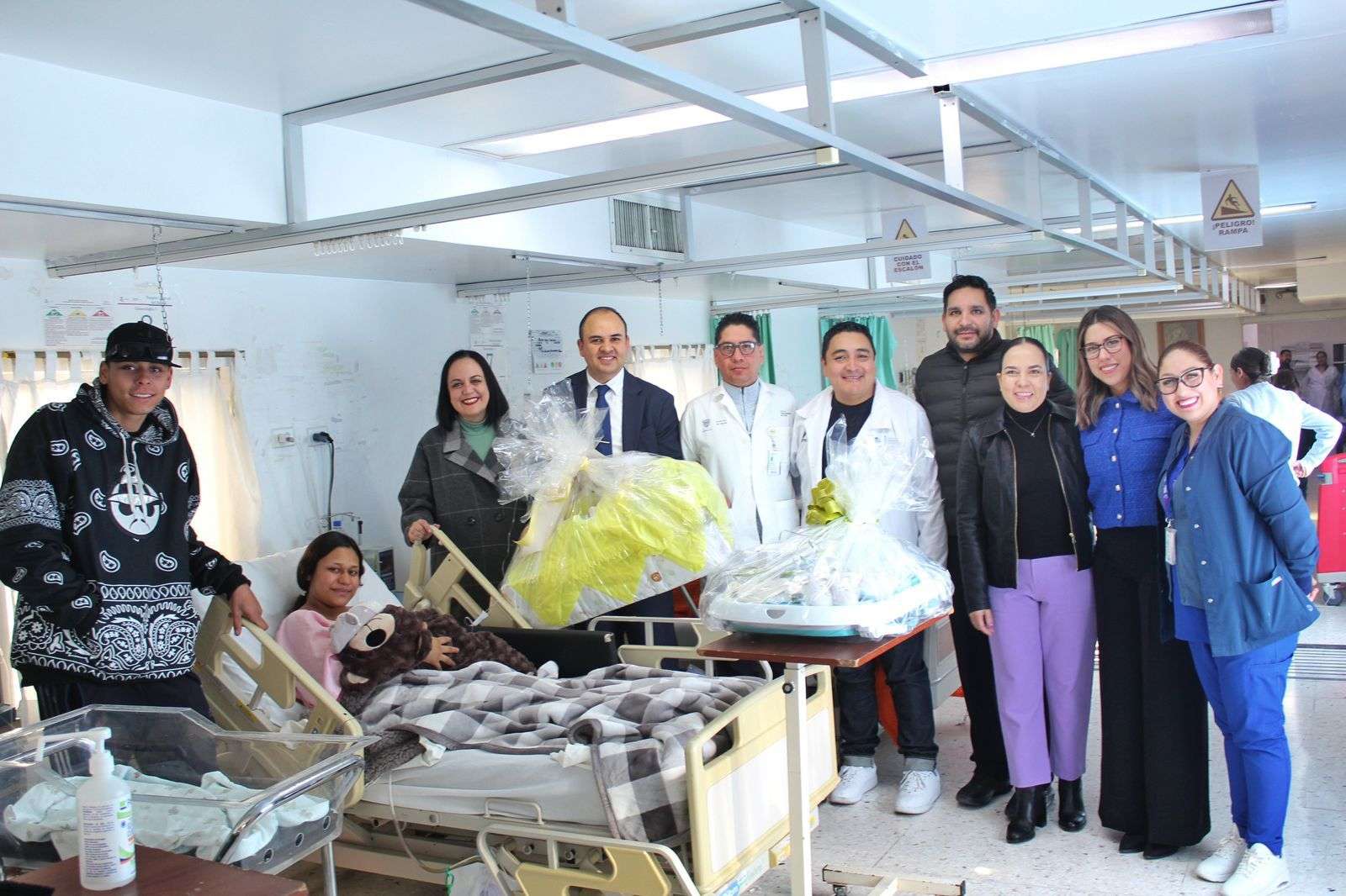 Rafael Alejandro Corral director del registro civil y Margarita Blackaller Secretaría Ejecutiva del Sipinna, fueron los encargados de extender las felicitaciones por parte de la Gobernadora Maru Campos y del secretario general de gobierno Santiago de la Peña, por ser el primer niño en nacer en el 2025.