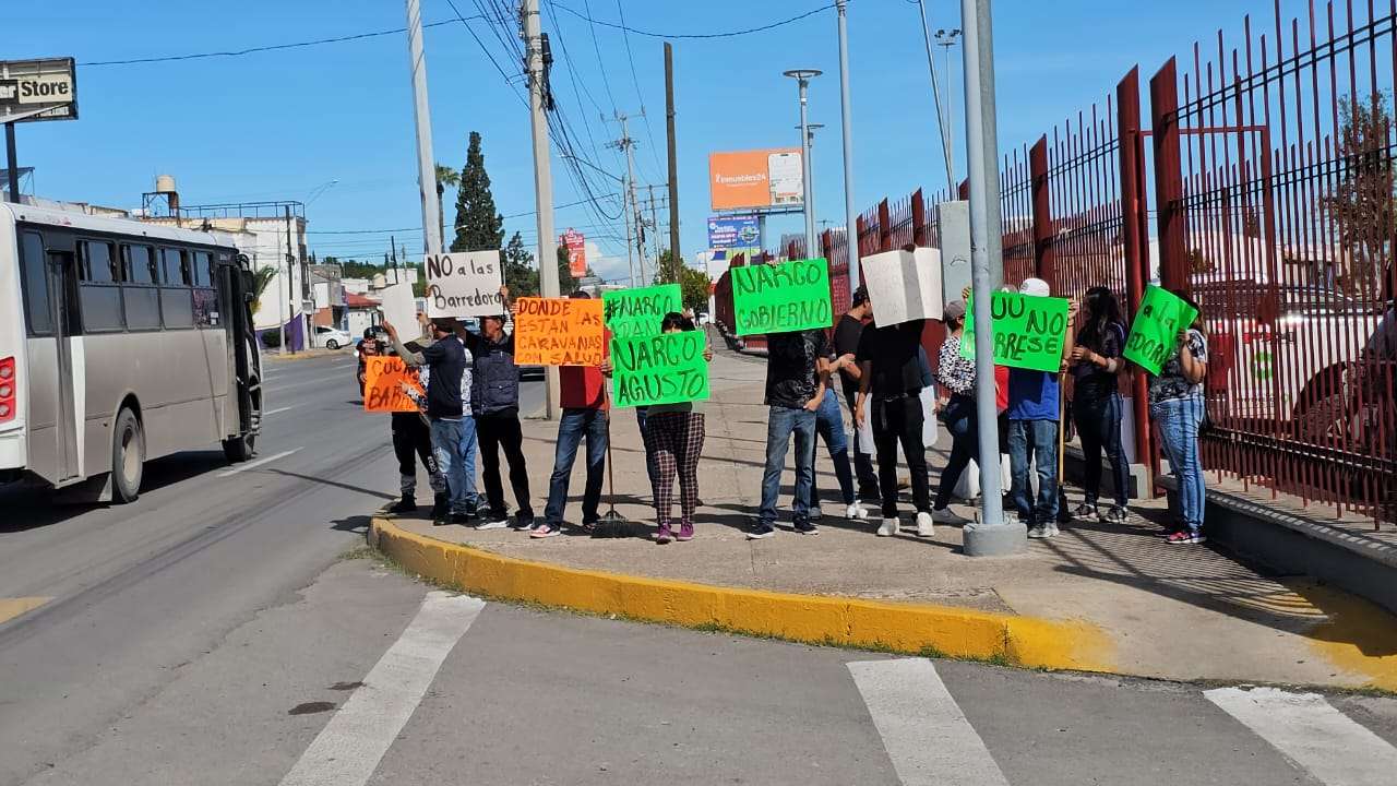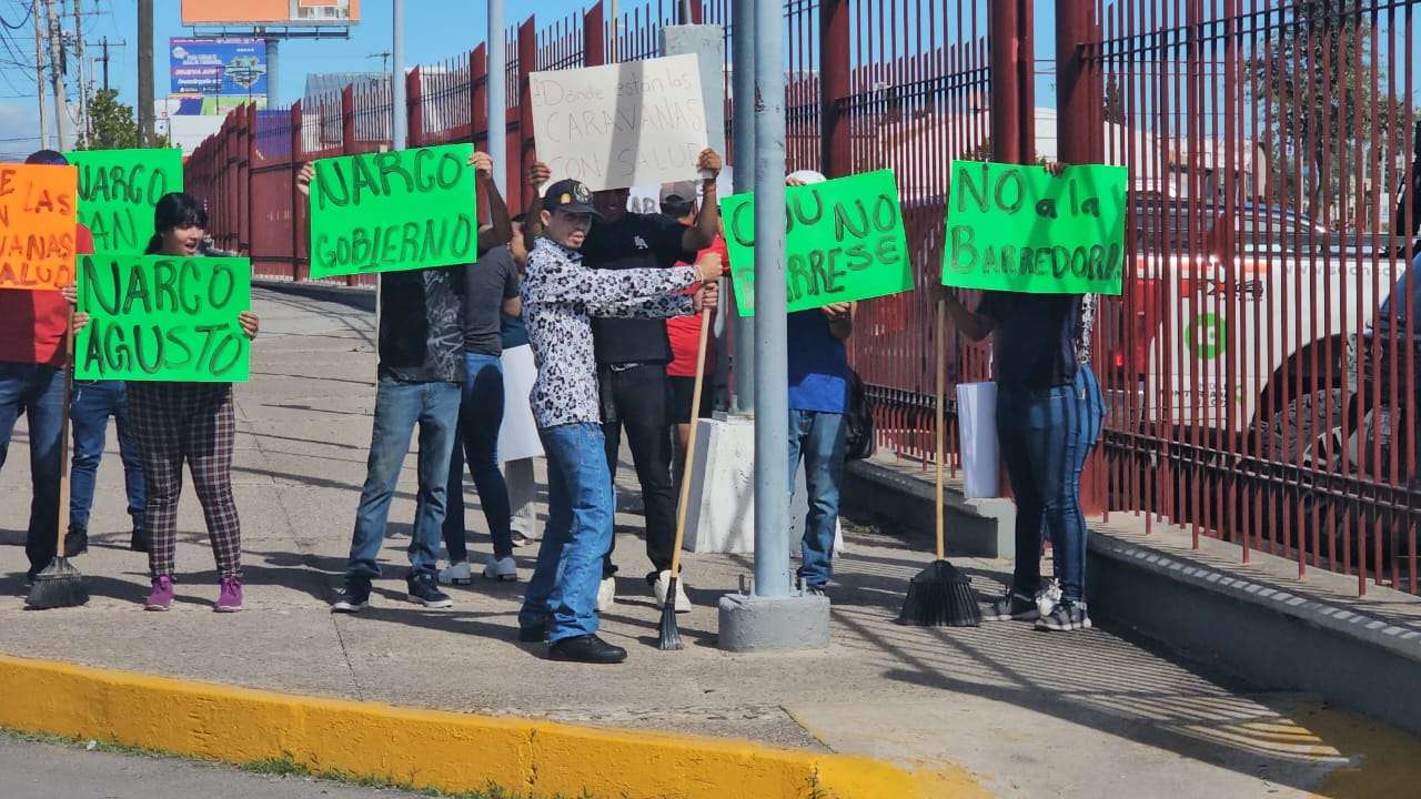 Chihuahua.- Un grupo de manifestantes se apostaron al exterior del centro de convenciones donde se lleva a cabo el primer informe de la senadora Andrea Chávez quienes portaban cartulinas que decían "CUU no se barre" y "narcoaugusto".