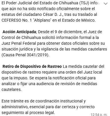 El Poder Judicial del Estado de Chihuahua (TSJ) informa que aún no ha sido notificado oficialmente sobre el estatus del ciudadano César D. J., tras su traslado al CEFERESO No. 1 "Altiplano" en el Estado de México.