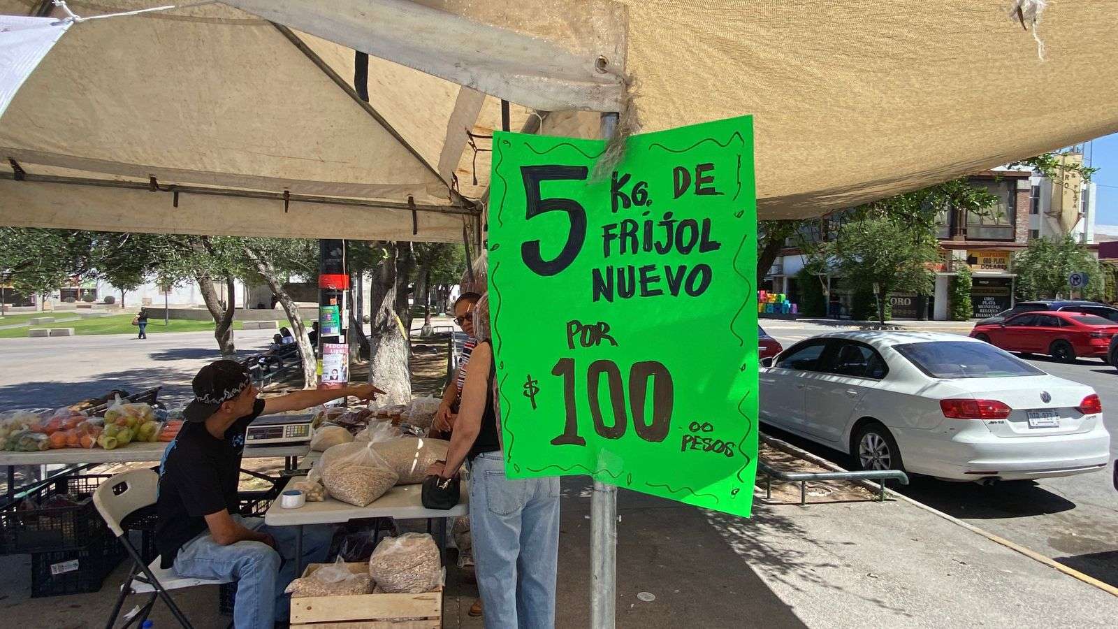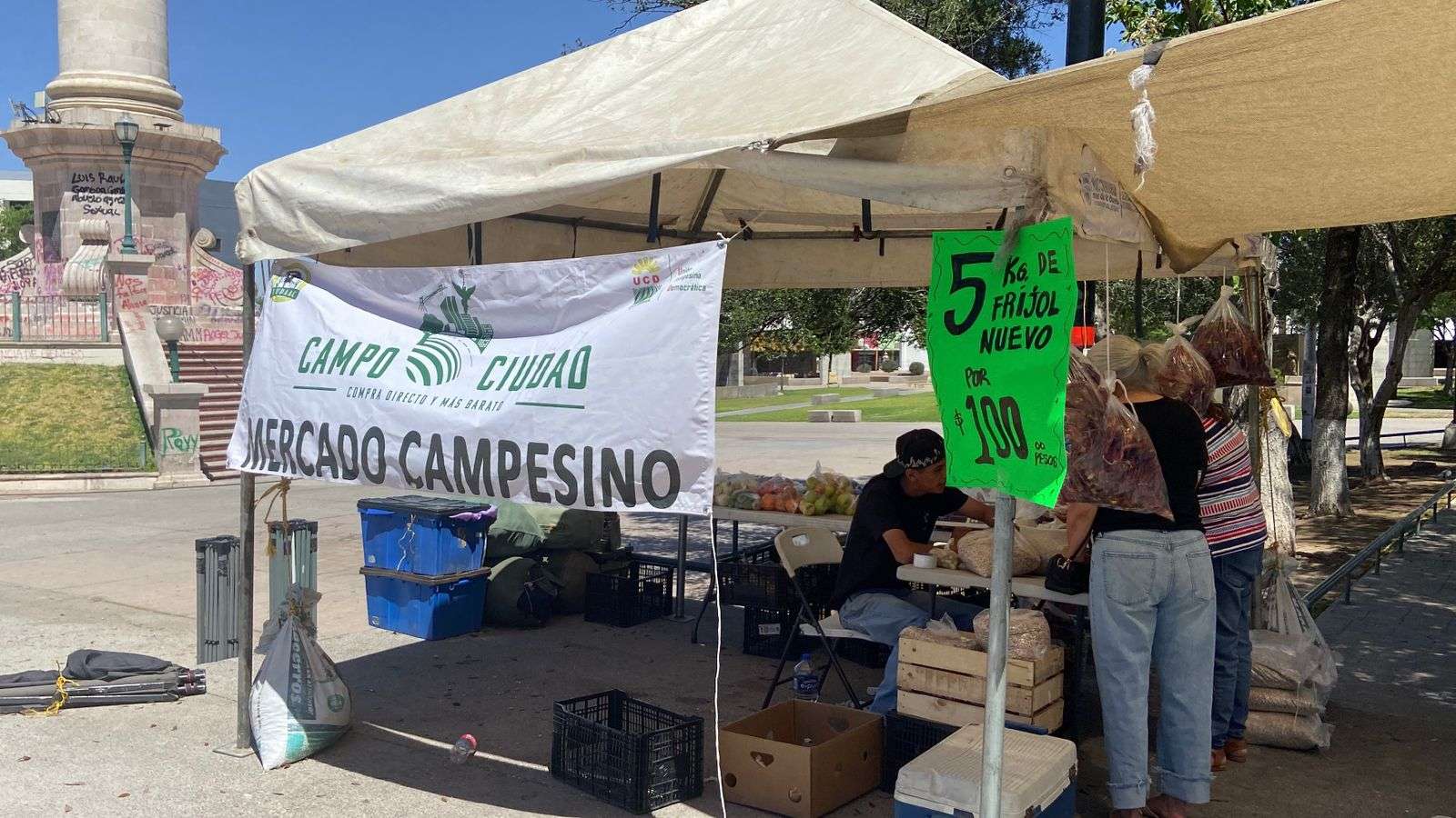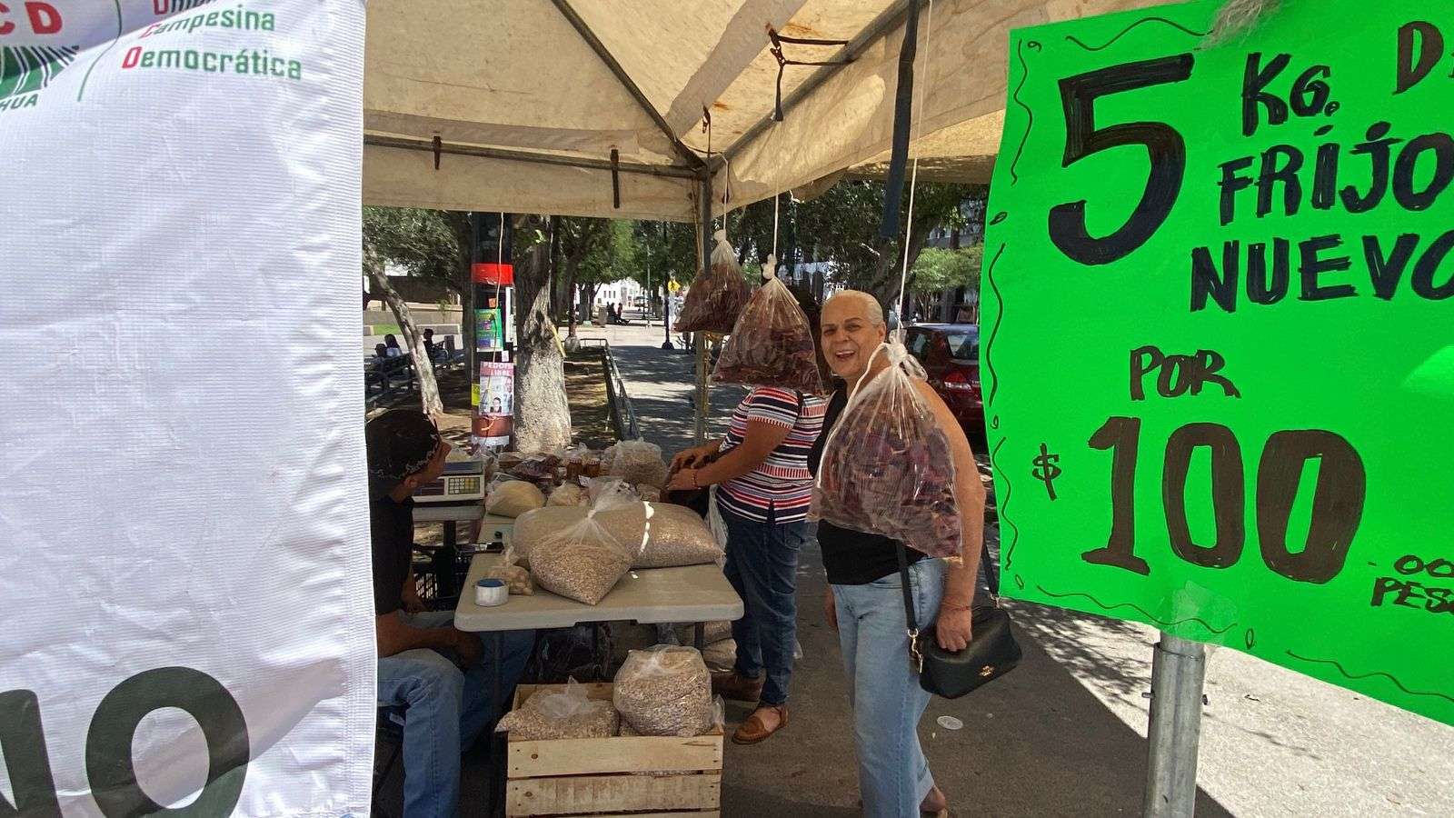 Chihuahua, Chih.- Tal como se anunció previamente, productores chihuahuenses instalaron un punto de venta en la Plaza del Ángel, donde ofrecieron cinco kilos de frijol por 100 pesos, precio que resultó sumamente accesible para las familias de la capital.