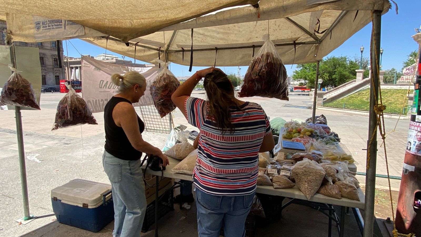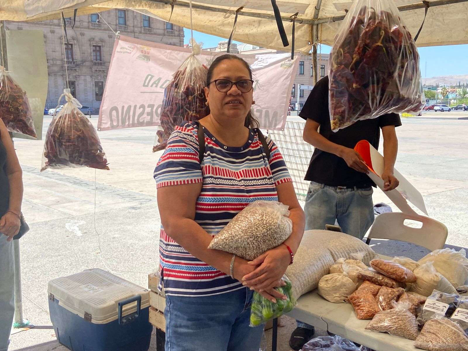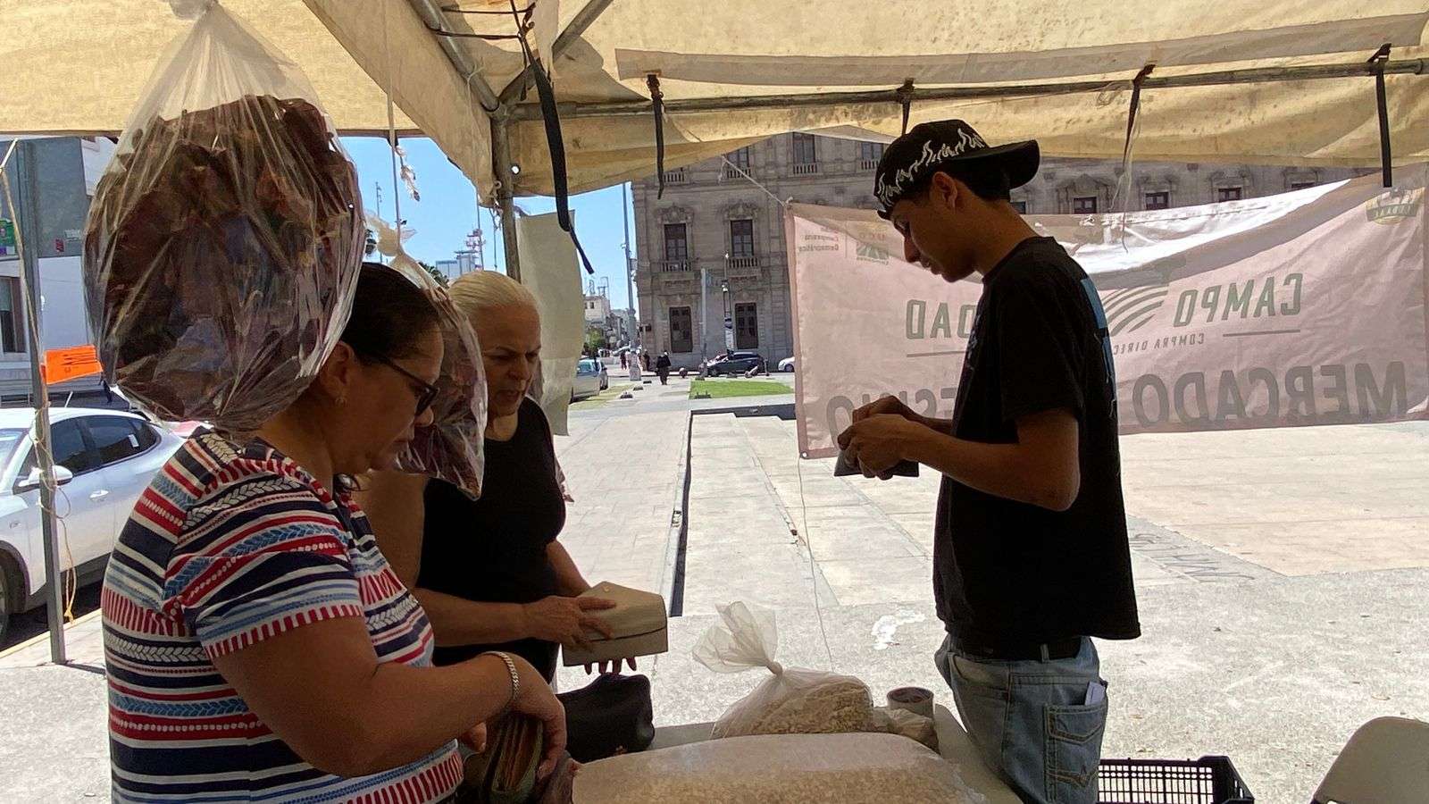 Chihuahua, Chih.- Tal como se anunció previamente, productores chihuahuenses instalaron un punto de venta en la Plaza del Ángel, donde ofrecieron cinco kilos de frijol por 100 pesos, precio que resultó sumamente accesible para las familias de la capital.