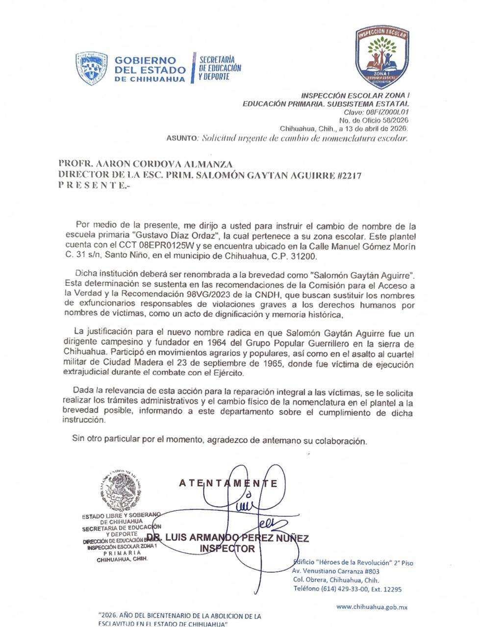 Lo anterior, mediante una instrucción perentoria, la Escuela Primaria con clave CCT 08EPR0125W dejará de rendir honores al polémico expresidente para adoptar el nombre de Salomón Gaytán Aguirre, un líder guerrillero e insurgente que cayó en combate contra el Ejército Mexicano en el año de 1965.