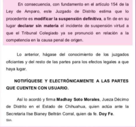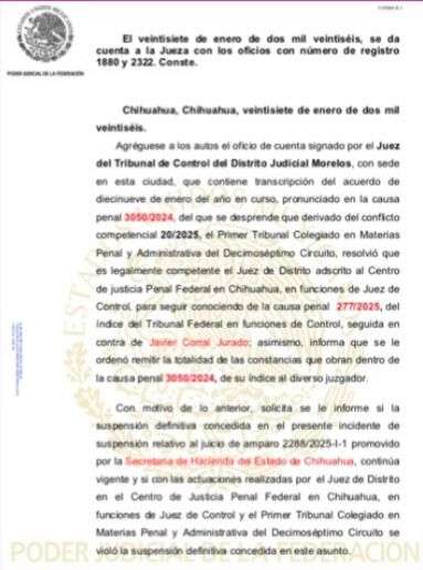 De acuerdo con el acuerdo fechado el 27 de enero de 2026, se informó a la jueza del Décimo Distrito en el Estado de Chihuahua que, derivado del conflicto competencial 20/2025, el Primer Tribunal Colegiado en Materias Penal y Administrativa del Décimo Séptimo Circuito resolvió que el Juez de Distrito adscrito al Centro de Justicia Penal Federal en Chihuahua, en funciones de Juez de Control, es legalmente competente para continuar con el conocimiento de la causa penal seguida en contra de Corral Jurado.