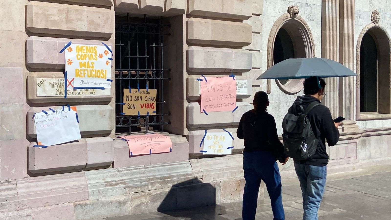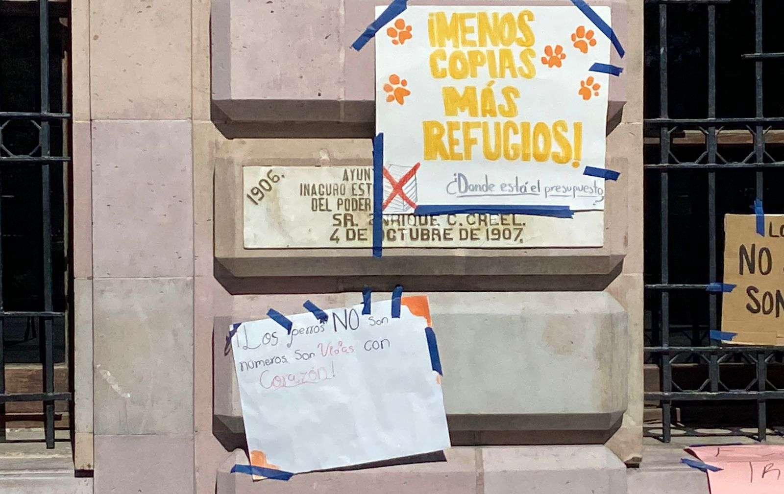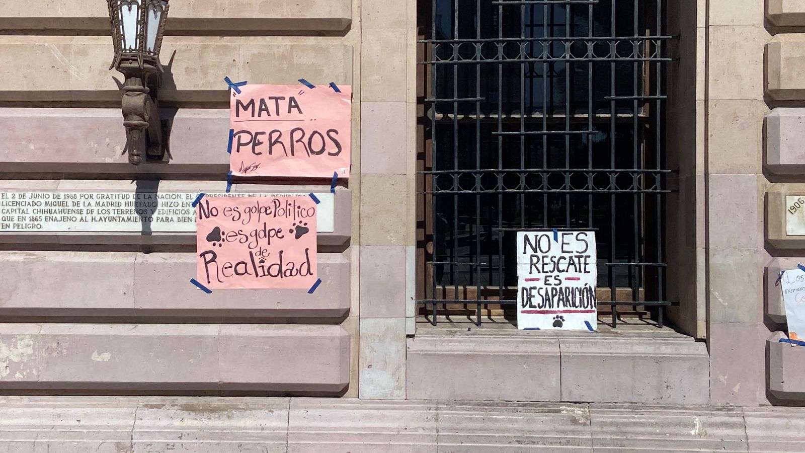 Chihuahua.- Integrantes de la asociación Cat Family colocaron pancartas en el edificio de la Presidencia Municipal como forma de protesta por las condiciones en las que, aseguran, se encuentran los perros en el albergue municipal.