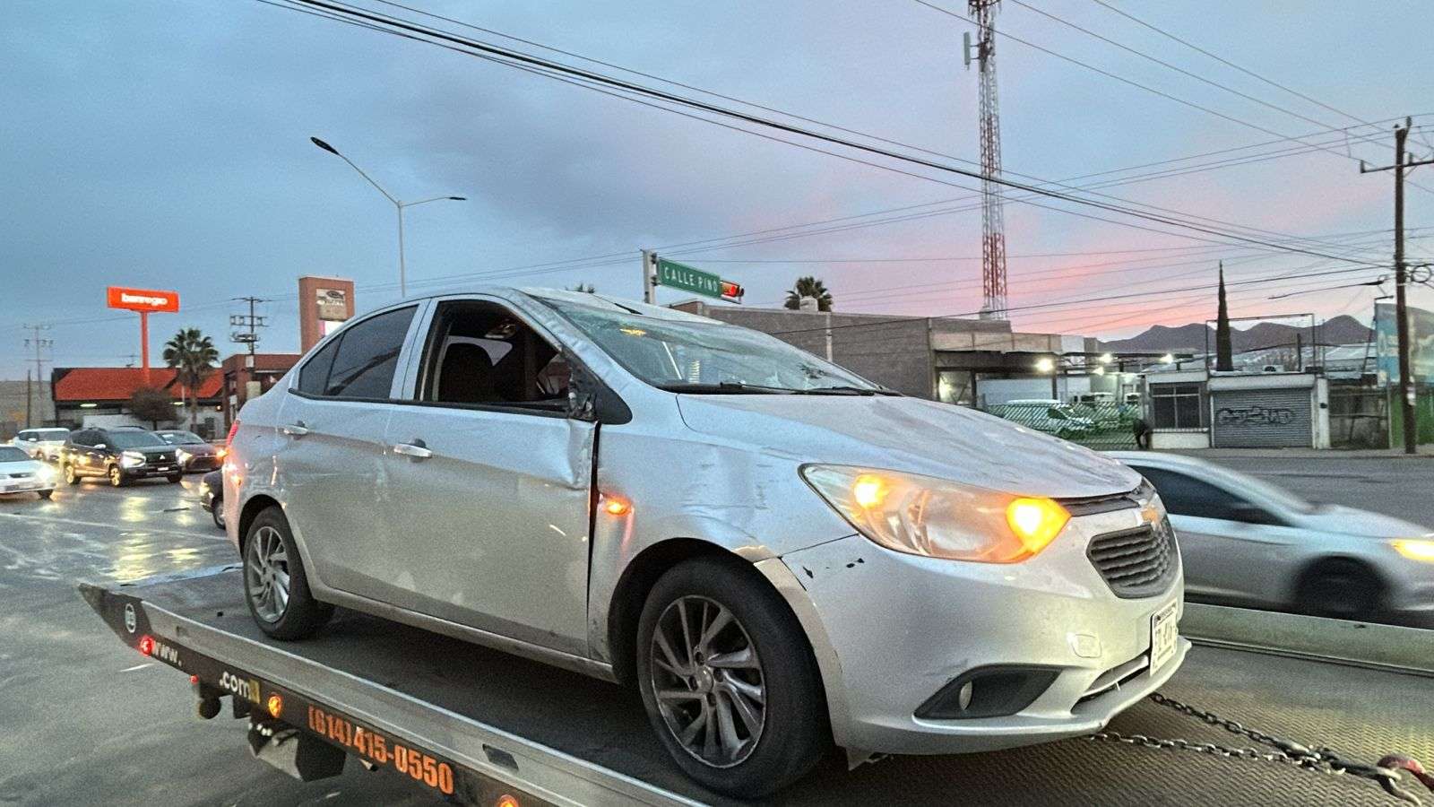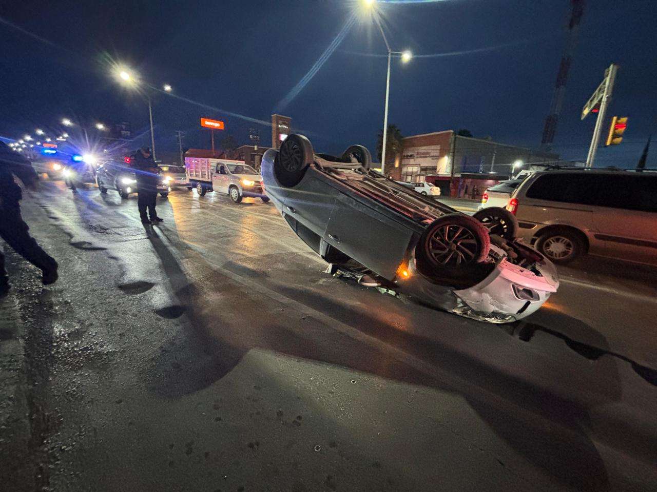 Chihuahua.- Un accidente vial registrado en el cruce de la avenida Tecnológico y Pino dejó como saldo únicamente daños materiales, luego de que un vehículo Chevrolet Aveo volcara a causa del exceso de velocidad.